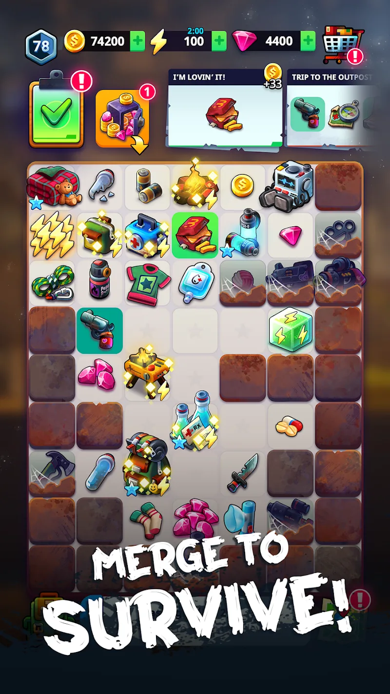 Merge 2 Survive Zombie Game Mod Apk en world, Merge 2 Survive keeps players hooked with crafting weapons, building shelters and slowly revealing a gripping story. Can you help unravel the zombie pandemic’s hidden truths while also building a safe haven for survivors? Surviving and sleuthing go hand in hand. Let the merge mania begin!FEATURESAt its core, Merge 2 Survive challenges players to match 3+ of the same item to merge them into more powerful variants. Merge wood to produce barriers, duct tape to craft armor, berries to make med kits, and so on.Freely roam the vast decay