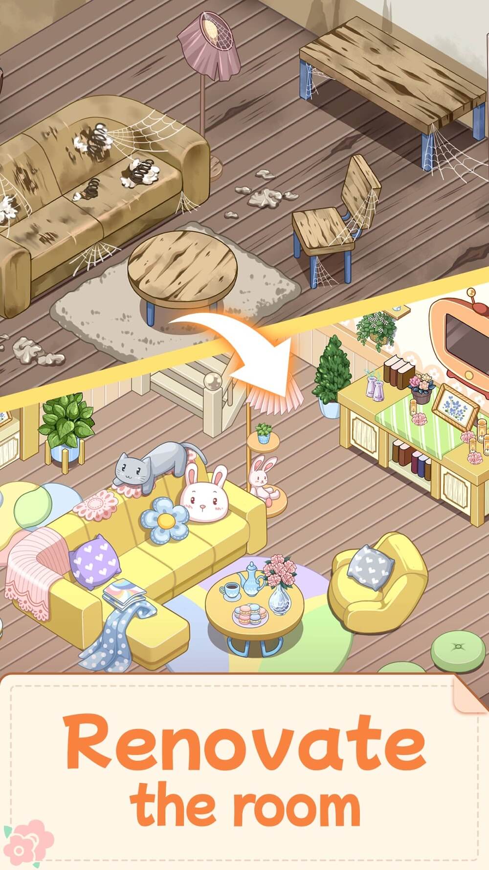 Merge Bloom Flower Town Mod Apk on machine once and consuming 1 stamina. As you make the necessary items, the town will gradually become more beautiful, so enjoy the changes while playing.MERGE BLOOM HAS CUTE ILLUSTRATION-LIKE GRAPHICS.The fact that the main character is cute is also a plus. I think the real pleasure of this kind of game is to watch it change beautifully, but I feel that this work stands out from the rest in its attention to detail. The image is a good example, the left is before, and the right is after. Can you see the figurines on the floor and the decorations on the walls and shelves increasing? I’ve played similar renovation games before but never experienced such a delicate design with many decorations. I guess that’s because the graphics aren’t CG, but illustrations. Even one small item is carefully drawn, so it is recommended for people who like doll houses and miniature food toys.GAMEPLAYHis m