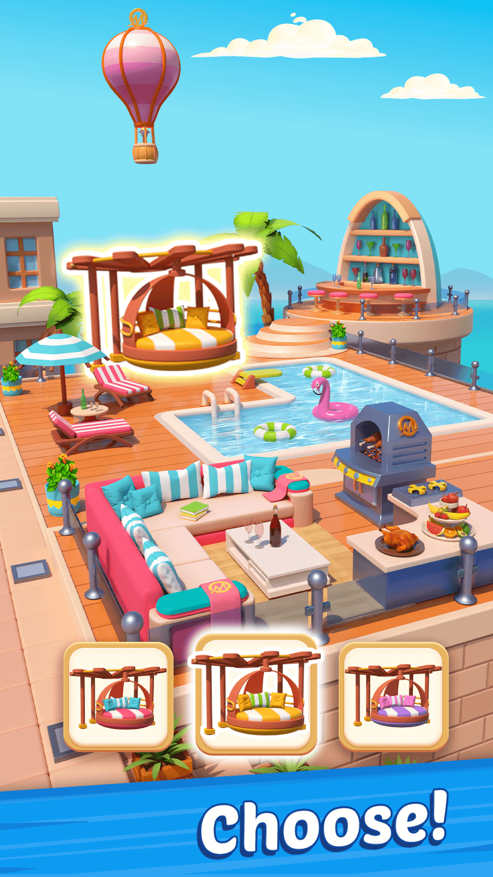 Merge Fever Premium uld match the items in the puzzle board to prepare the ordered food, so if you are unaware of that item or how to prepare it, tap on the thing you want to see information about it. If you serve the orders to your restaurant customers, you can earn stars from them with your performance. In that way, high stars can earn more rewards like thunders and coins to build and develop the restaurant of your style. Suppose one of your restaurant plans is to develop Pool Side BBQ, so the first task is to fill the Pool, and perform