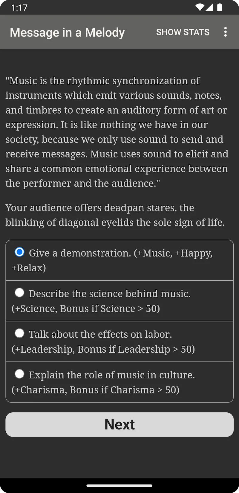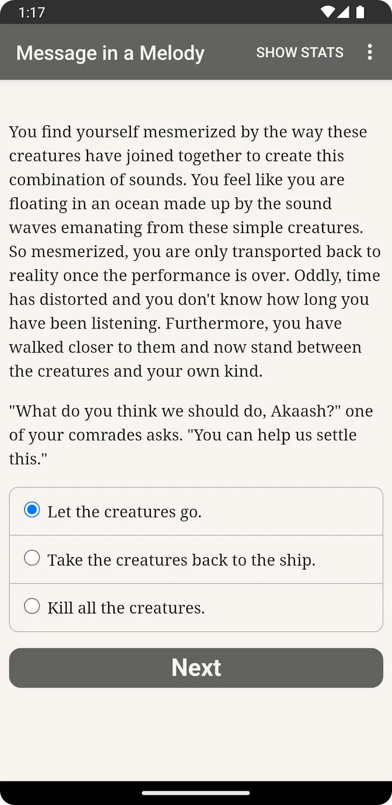 Message In A Melody Mod Apk peared.Unique Perspective: Music is something that does not exist in the aliens’ society and becomes a main mechanism to save people. From there, an interesting journey opens up through important details with the novel’s interface.Choice-Driven Story: Everything is introduced in a completely detailed way that is moderate for the player. In particular, they have to make many different choices that affect the game’s outcomes.Interactive Soundtrack: Throughout the journey of discovery, each person