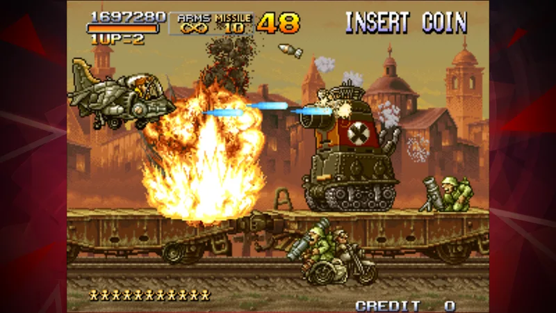 Metal Slug X Aca Neogeo Premium d during missions to purchase new weapons like flamethrowers, rocket launchers, lasers, shotguns, and more from the in-game armory. Upgrade firepower!INTENSE ACTION-PACKED STAGE DESIGNSBattle through jungles, villages, enemy bases, and more while evading traps, rescuing POWs, and riding slug mechs! Diverse, creative stages will test your reflexes. Each stage culminates in an epic boss fight like giant tanks,