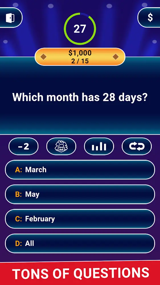 MILLIONAIRE TRIVIA Mod Apk is an exciting and engaging game with extremely tough questions. You can also participate in playing with your friends and play online most attractively and attractively. With interesting quiz questions and unique tips questions to help you learn more new things in life. Players are free to enjoy an extremely fun space with a very beautiful and eye-catching interface.SOLVE TOUGH PUZZLES IN THE GAMEThe game opens you up to thousands of different questions arranged in consecutive order of difficulty. The opening is easy, and close sayings with a low level of connotation; the tips are low and limited, but as you progress to higher levels, you will receive much more complex questions. Thanks to