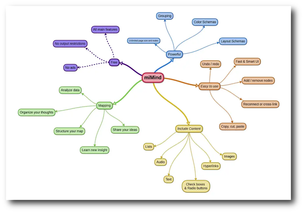 miMind will be an application that allows users to design different types of mind maps to unify a specific topic. This will be an extremely suitable application if you are looking for a quick and varied way to draw mind maps right on your mobile device. With this application, users will be provided with many basic and complex features so that you can use and create the best type of personal mind map for yourself.FULL-FEATURED DIAGRAMMINGOne of the unique features that mind maps can bring to their users is the unique colorful drawings. With miMind, users will be able to create for themselves a beautiful mind map with lots of different colored lines and curves. Not only that, but the application has also equipped its users with many different shapes such as square, rectangle, oval, circle, hexagon, cloud, octagon, and many more to be able to integrate into your diagram.SIMPLE INTERFACE, EASY TO SHAREAnd to optimize the best way for mind map designers, the application has designed a straightforward user interface for its users. With only simple navigation and input operations, users can quickly create a diagram according to their personal preferences and needs. At the same time, the application also allows users to share very well through sharing directly with the application or exporting it to an image, PDF, text, or XML file quickly.