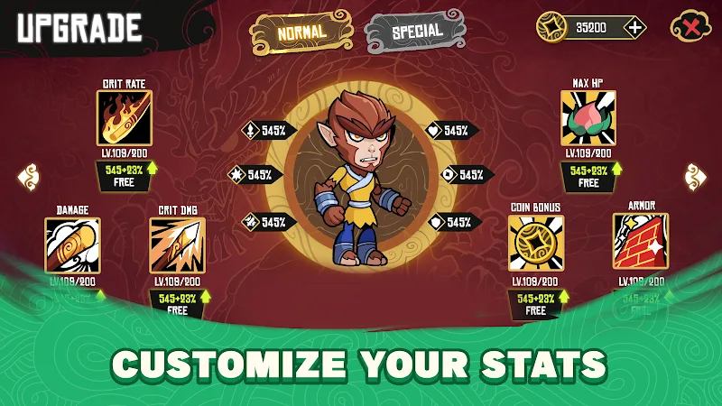 Monkey King To The West Premium dventure will take players through different stages of development. Players can visually observe the development of the body and skills as you evolve through each battle.EPIC BOSS BATTLESIn addition to facing normal enemies, players also have the task of solving legendary enemies. You will be invited to join extremely difficult strategic challenges to affirm your fighting skills. Ahead of you is a series of glorious rewards waiting.Legendary Foes: Players are facing legendary demons and gods in thrilling encounters. They are the eternal enemies of Wu Kong that you will have to deal with in this wor