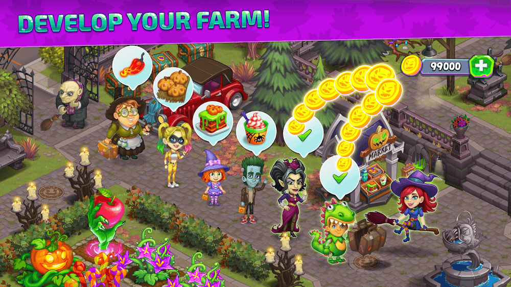 Monster Farm Family Halloween apk-en A FARM FROM AN ABANDONED TOWNAt first, everything in front of you is a ruined town. To build their farm, the player will begin renovating the area. Older homes will also be updated to look more modern. They are dividing land suitable for farming and raising livestock. Build a stunning landscape with giant statues at once. After getting a certain amount of coins, focus on scaling. The more land the farm has, the easier it is to grow crops and raise livestock. On top of that, when everything is at maximum output, the money is increased.