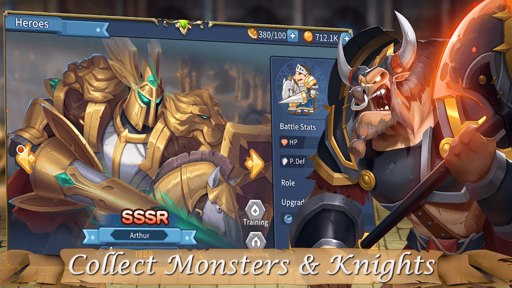 Monster Knights Mod Apk r highest trademark scores. Collect monsters and knights by checking their battle stats in this fantastic action combat. Build a homeland and train pets so that they accompany you in this battle and help you to fight the monsters.Destroy the required amount of barrels and collect coins, valuable crystals, magical powers, upgrade battle stats, and many other rewards. You can Build war towers like Magic Tower, Canon Tower, Ice Tower, Arsenal Tower, etc., for defense in this Monster Knights – Action RPG gam