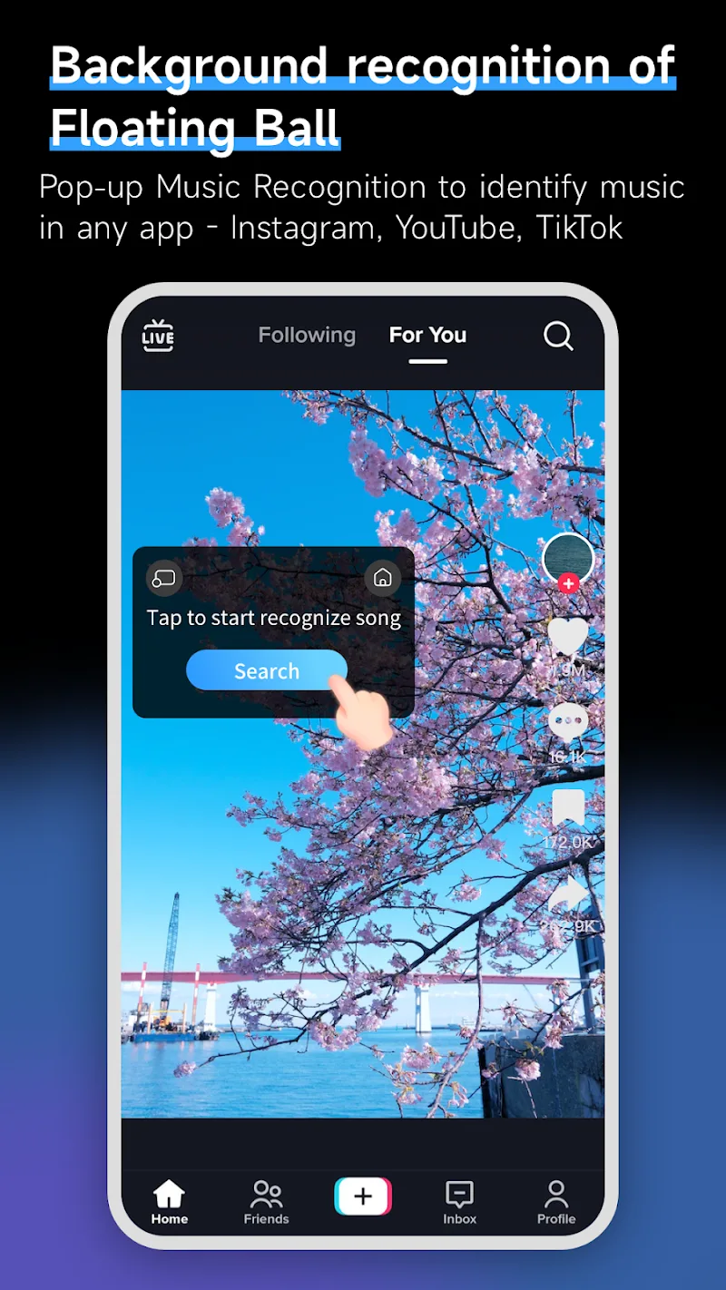 Music Recognition Find Songs Premium lists of discovered music via Spotify integration. Share favorite finds or music maps of your journey via social media. With tight media integration, Music Recognition makes discovering and sharing new music incredibly intuitive.EXTERNAL RECOGNITION VIA POPUP MODEA handy feature is the ability to detect songs playing in external apps. Trigger the popup recognition from anywhere while listening to music. The floating widget will automatically grab a clip and return the result. Use it seamlessly while browsing Instagram or watching TikTok to identify songs. This makes Music Recognition a versatile second-screen com