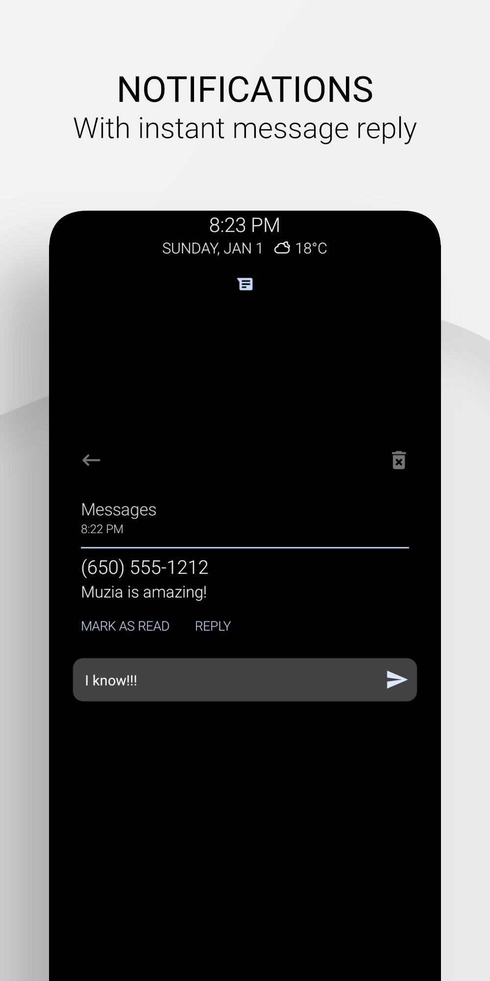 Muzia Music On Display Premium ess the system, the application can help you switch songs faster. From there, this will help you save a lot of time and energy.INTERACTIVE SMART DISPLAYThe application’s features do not stop at being compatible with player applications but also other genres. From there, the orientation towards convenience is completely understandable over time.Instant Messaging Reply: Instead of having to access the main interface, messages from applications can be replied to faste