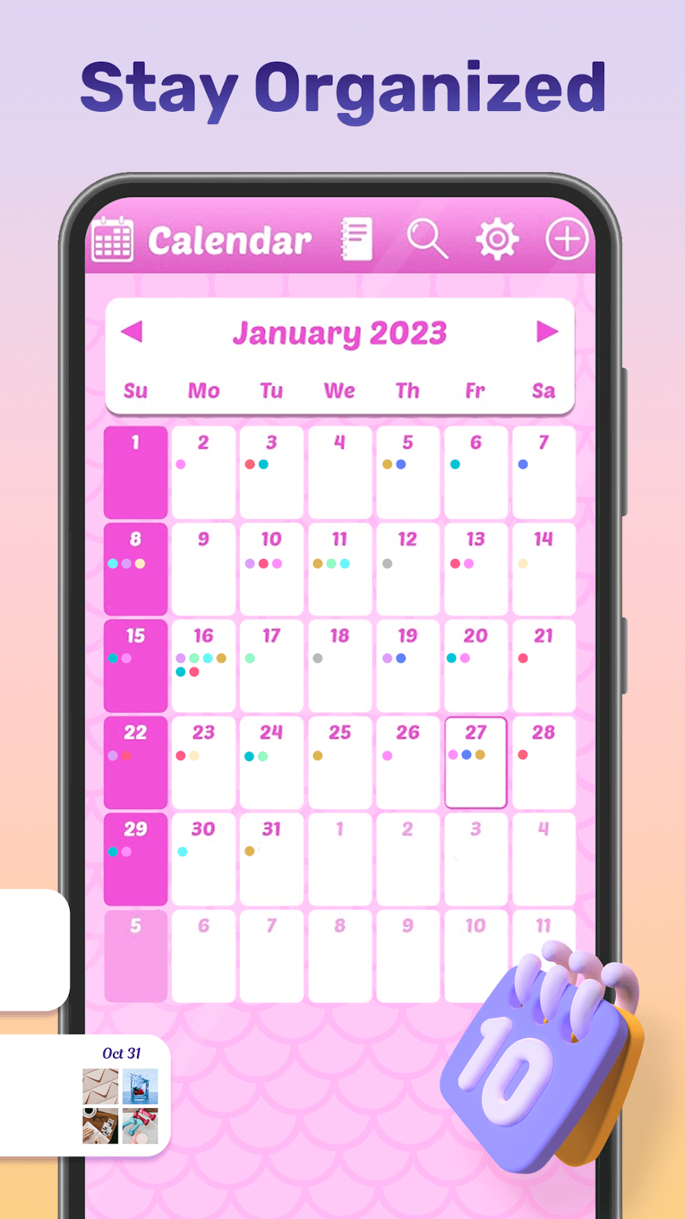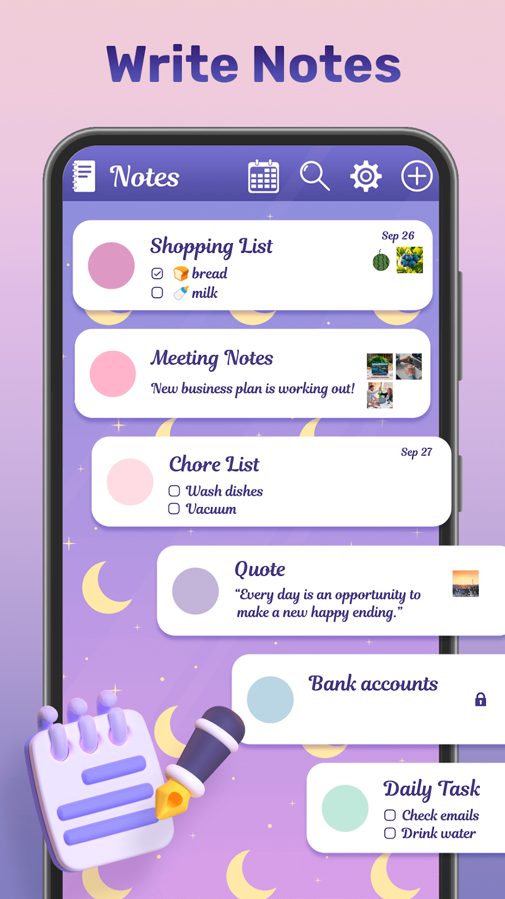 My Color Note Mod Apk arking colors for easier sorting out the content. Depending on users’ self-preferences, the colors can be anything for users, such as priority, importance, objects, and more. Thus, the customization is wide and has different outcomes for users to customize and alter various elements to make the notes more vivid. The process of taking notes is also easy, and users can easily put anything they want in the content.STAY ORGANIZED WITH THE CALENDAR VIEWBesides taki