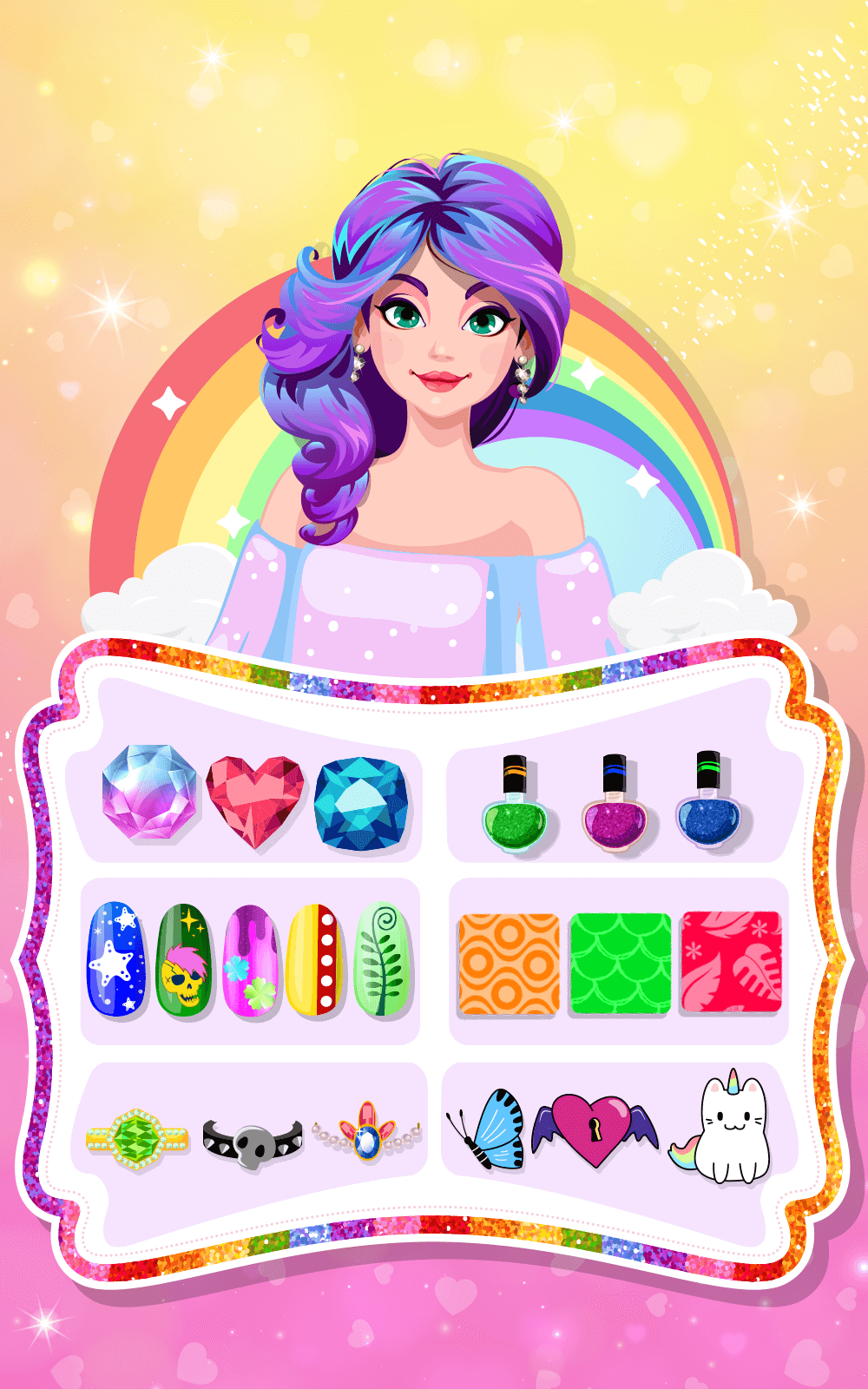 Prepare yourself for the most beautiful, creative, and addicting experience you’ve ever had with nail art. We are pleased to welcome you to the manicure Salon Game Girls Nail Art, where you can create amazing manicure designs and become a famous nail artist. Playing one of the top nail art games available for ladies lets your creativity run wild.A WORLD OF OPTIONS WHEN IT COMES TO NAIL DESIGNPlunge into the world of nail design with many options at your disposal, such as hundreds of hues, glitters, fashion gems, beauty patterns, attractive nail polish stickers, and decals. Cr