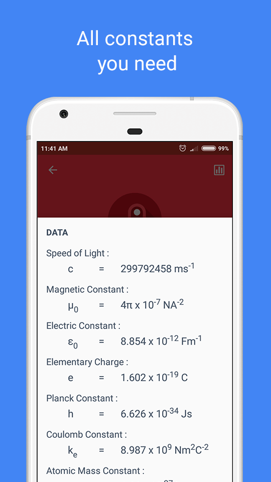 Physics Pro Notes Formulas Premium mulas becomes suitable for each level.Visualized Explanations Icons: Clarity is the top criterion of the application when it does not cause complexity. Everything is clearly illustrated to create interest and maintain their attention for a long time.ESSENTIAL CONSTANTS DATASHEETIf you want to look up important knowledge related to physics, everyone can look it up quickly. This helps everyone save time and not get bored.Quick Reference Guide: All necessary physics co