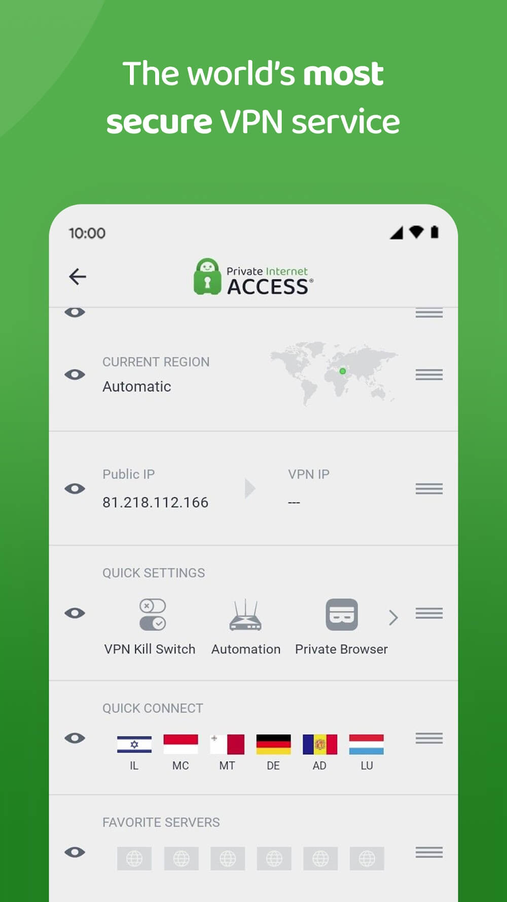 PIA VPN Mod APK protects your data and identity instantly. Secure Internet Freedom, Secure Connection, Online Privacy, and more with PIA!Private Internet Access VPN helps users overcome many different barriers and still stay safe on the Internet. Advanced security features allow users to customize their information so that it will not be stolen after just a few seconds of connection. At the same time, the number of servers is quite diverse and can be selected directly from the information provided. It can be said that as long as the connection is green, you should connect to that server immediately to enjoy the feeling of high-speed web surfing.SECURE ENCRYPTIONPrivate Internet Access VPN creates freedom for internet users when they are no longer limited by many different factors. Users can go to any website regardless of whether that website supports IP in their country or not. Therefore, VPNs have always become the top choices for many people, but there are also some factors that need attention such as an increased number of visited websites and higher risks. Of course, users do not need to worry about these things and let the application protect you in the most professional and accurate way.Security parameters