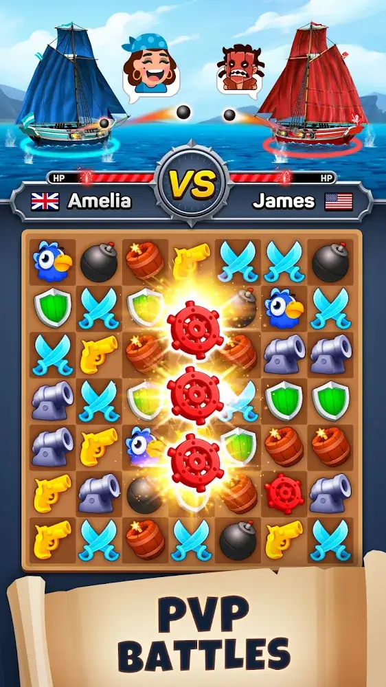 Pirates & Puzzles takes you to pirate raids full of surprises ahead. You will transform into talented pirates and lead a pirate gang. Players fight against other gangs and scramble for treasures. Besides, you also own powerful ships and great teammates. You will have highly thrilling and engaging water battles.BUILD A MIGHTY PIRATE ARMYPlayers will be able to role-play their favorite characters as well as choose for themselves the best teammates. You need to consider it carefully before choosing because it will determine the whole journey to conquer your treasures. Your teammates will be fully equipped with weapons as well as unique armor set
