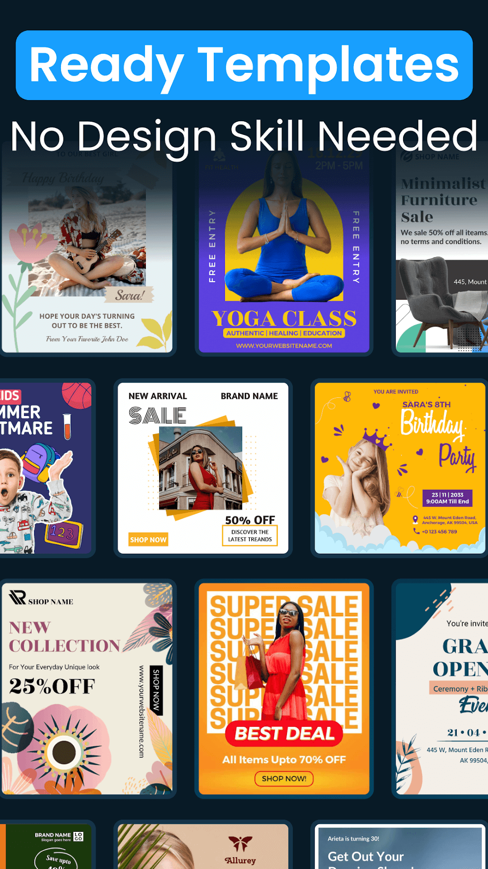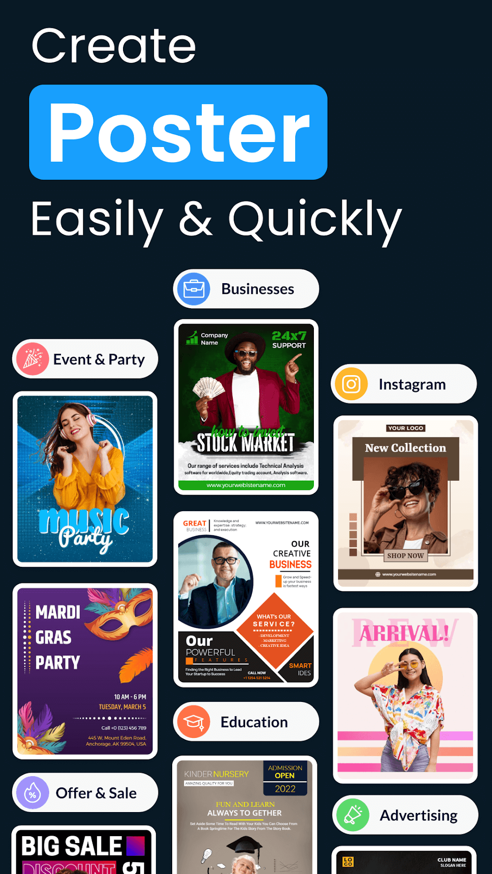 Poster Maker, Flyer Maker is an application that allows you to design and create your own posters and flyers easily according to your wishes and preferences, whether you are not good at graphics or not. If you have a lot of exposure to the design field, don’t worry; we will help you through our application to create posters or flyers easily and conveniently with more than a thousand built-in templates.QUICK AND EASY TO USEEase and convenience are the biggest advantages of our application. In our application, you do not need to have knowledge or skills about designing posters or flyers because we have integrated for you. It has a simple, easy-to-use interface and provides you with a thousand different flyer and poster templates to help you freely create and design flyers and posters with your brand.Intuitive Interface: With a simple and intuitive interface, we will help you conveniently and easily design posters or flyers in the easiest way without you needing to have experience or graphic design skills.Pre-Designed Templates: Our application has more than ten thousand poster templates and more than ten thousand flyer templates built-in, so you can freely choose according to your personal preferences or refer to available templates to design your own. I have your own personal posters and flyers.Customizable: In addition, you can customize the text as well as the images you have added to the poster or flyer you design, making it easier for you to design quality posters and flyers.VERSATILE APPLICATIONSIn addition to helping you design posters and flyers, we integrate many different functions to help you advertise what you want on posters or flyers. We also provide you with the ability to create other things like flyers and food and drink menus for restaurants or cafes, so you can easily create flyers or posters for a variety of industries and occasions. Another big day.Promote Anything: Through our application, you can create posters and flyers that can advertise anything you want for businesses or important events, products of big brands, and utility services of the professions.Varied Outputs: We have integrated into the application features that not only create posters or flyers, but you can also create other things such as menus for restaurants or hotels or banners for occasions great ceremony.Multi-Channel: After completing the design, we also design it so that you can easily and conveniently print it or post it on the website forums you want or you can post it on your social networks because we have integrated it.Tailored Usage: You can adjust your designs to suit industries such as restaurants, hotels, cafes, and entertainment venues, and you can also adjust them to suit other industries. The important occasion you want to attend.TIME-SAVINGOur application helps you save yourself time by helping you create designs for posters or flyers easily without you having to have experience or skills in this field. Good graphic design requires you to learn to be able to use other graphic design applications fluently and make it convenient for you to do many other things without having to spend time thinking about the design for posters or flyers because we integrate many templates for your reference.Huge Selection: Are you worried that you can’t think of a design for posters or flyers, or that you don’t have any ideas for graphic design, or that you don’t have experience or skills in designing? Don’t worry, we have built in more than ten thousand posters and flyers for you for easy reference and use.Fast Editing: In addition, we also support you in quick design for urgent designs that you don’t have time to come up with ideas or draw up a design in your head, don’t worry, in just a few minutes you can create a poster or poster. leaflets through the support of our application.Instant Downloads: After completing the design, you can download and print the posters and flyers you have designed quickly and conveniently, which will help you a lot in tasks that require a short time.Avoid Design Costs: If you use our app you will save a lot of money to invite graphic designers to design a poster or flyer for you and this will take you a lot more time than you use our application.PROFESSIONAL QUALITYThe designs you design on our application will bring the most professional quality like designs that only people with expertise, experience and skills can design, You can continuously customize your design, and the application will support your design in high resolution without having to worry about your design being blurry or worse than in the copy design that you have designed on the application.Beautiful Designs: We provide you with beautiful and eye-catching design templates that help you easily advertise the services and brands you desire without worrying about your design looking rustic and boring ugly.Full Customization: We will provide you with detailed customizations so you can easily create professional and beautiful designs that suit your preferences and reflect your personality. Your design looks more professional.Premium Templates: Furthermore, we also provide you with limited designs by the best and most professional graphic designers from around the world to help you freely choose posters that suit your preferences.