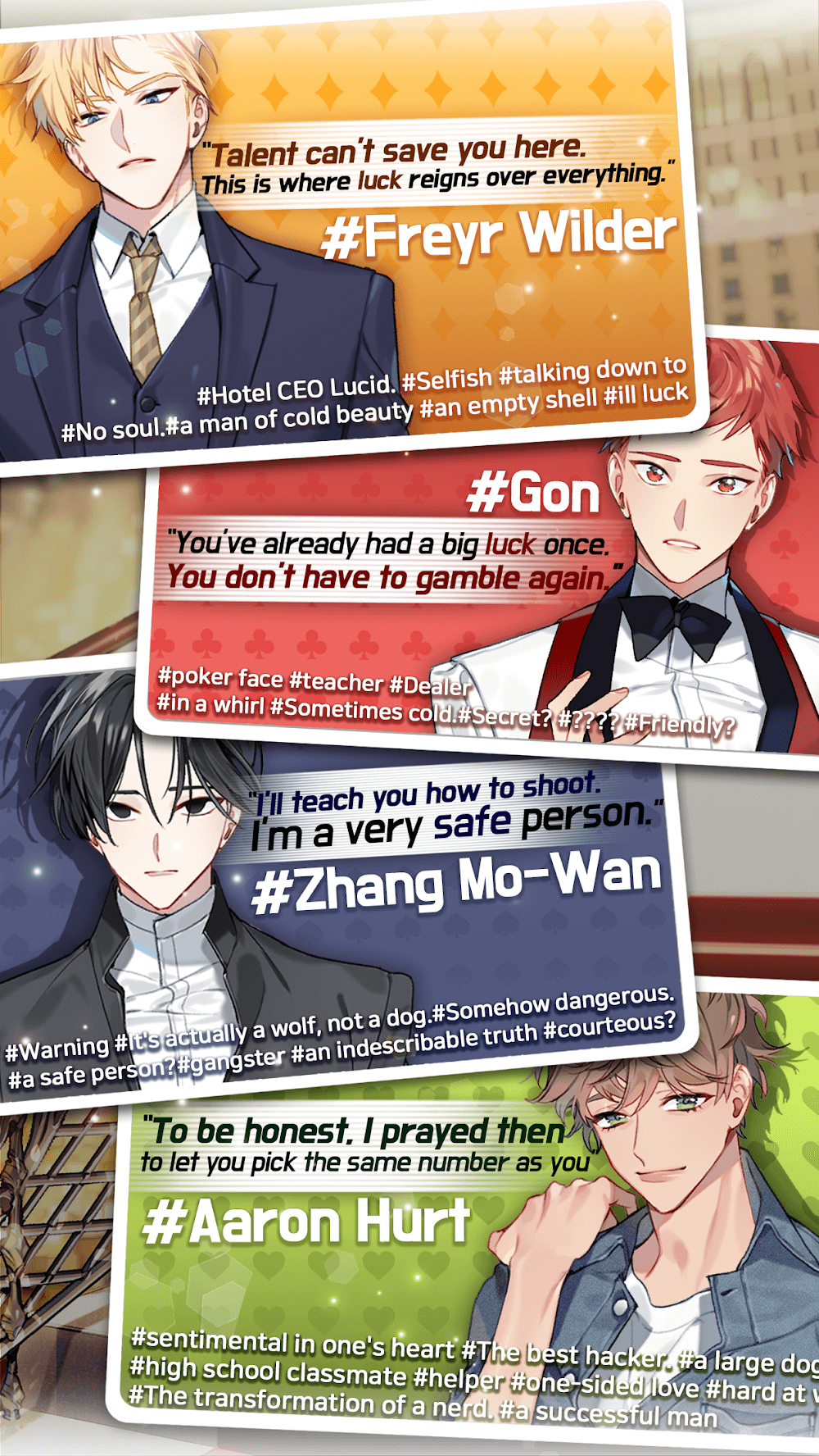 Queens Number Mod Apk ombination of thrilling, mysterious elements in the quest and romance in love will help you feel more excited when experiencing.Besides investigating the hotel, you will discover a fascinating love story of the main character in the lavish city of Las Vegas. Queens Number: your choice will give you four characters to choose from, Gon, Zhang Mo-wan, Aaron Hurt, Freyr Wilder, and they are also four elegant guys who will accompany you. Although they all have a handsome appearance, each person wil