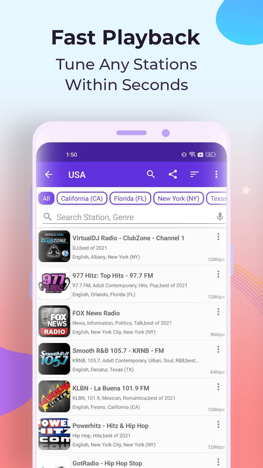 Radio FM Mod APK will provide you with a wealth of interesting information on a wide range of topics you can select.Radio FM is an application that can help you listen to and enjoy important news or interesting announcements about daily life, as well as super attractive and engaging podcasts. If you have a passion for listening to the radio, then this is the most suitable application for you. Here, you will discover and admire many special features and utilities that it brings. Don’t forget to download it on your phone so you can use it anytime, anywhere.LISTEN TO RADIO & PODCASTSWhen using this application, you will be free to search for the news you want to listen to. The radio system always has new announcements, special news is always broadcast and updated regularly. Besides, you will be free to enjoy and choose different music genres depending on your preferences.Wide Variety: In this application, you will have access to hundreds of different radio stations from all regions. Each region has its own unique news, bringing you many interesting and interesting news reports.Diverse Genres: Freely choose for yourself the best music news or podcasts to listen to and contemplate. There are genres for you to choose from, such as comedy, current news, hip-hop,…Discover Podcasts: Search for podcasts you want to listen to and enjoy them with just one click. By listening to podcasts every day, you will understand more about areas of life, have a more relaxed spirit, and have more positive energy.CUSTOMIZABLE EXPERIENCETo have a good habit, you should set an alarm clock so you can’t forget to listen to the radio every day. Besides, you have the right to create lists of the channels you like to listen to the most in one detailed section. Thanks to that, every time you want to listen, you don’t have to spend a lot of time looking for it.Create Favorites: Freely create your own favorite albums and list the stations you like and listen to most often in a clear list. This way, you will save a little more effort and time.Wake Up Right: To avoid missing the news you like to hear the most, you can explicitly set alarms for yourself. Please choose a fixed time frame to set it to your liking.Sleep Timer: The application has an extremely convenient sleep timer feature. You can turn on listening and choose 10 hours a day to sleep. At 10 o’clock, maybe you fall asleep, the listening tracks will automatically stop. This helps you save battery.INTUITIVE CONTROLSThe application has a modern, intuitive interface, all colors are coordinated and easy to see. This has made users have an enjoyable experience and have a deeper impression of it. Everyone has the right to download and use this application freely, spread it and introduce it to your friends and relatives to enjoy together.Easy Navigation: You have the right to easily navigate the application in your own way. With just a double click, you will complete all the operations you want in a great way.Quick Swapping: You are allowed to quickly swap tracks between items you like.Modern Interface: The interface is clear, tidy, and modern, creating an extremely eye-catching application that is easy for the eyes to use.ENJOY ON MULTIPLE DEVICESThis application is increasingly popular all over the world so you can search and enjoy all different radio stations easily. All phone models can use this application, so you will feel free to download it to listen.Stream Anywhere: You can open the app and listen to live radio in a very simple way. In your free time, open meaningful podcasts and enjoy them. The pressures in life will also be greatly reduced, and you will have a happier spirit.Listen Anytime: Listen anytime you want. You can listen to the radio on the bus, while cycling, while playing games, while doing housework, etc. Feel free to listen anywhere you want.FREE TO USEThis application is extremely useful and free; users do not need to register or purchase to download it in just a few seconds. With a huge, unique, and rich music treasure, you can listen to it all your life and never get enough of it.No Fees: You can share this application on social networking sites to introduce and spread it to your friends and community to join in using it in a great way. You don’t need to spend any money to own the beneficial features it brings.Unlimited Listening: Podcasts created and posted by famous authors. They share their experiences and life lessons through those podcasts, so users are very satisfied and excited to use this application.Best Free App: This is an application voted by many users and is considered a modern, useful application that brings a great experience to them.