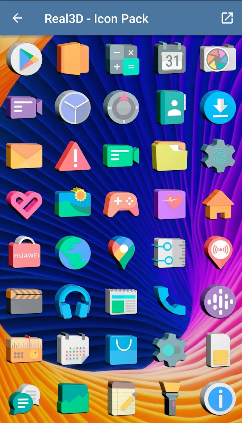 Real3d Icon Pack Premium e application provides icon templates with diverse shapes and soft pastel colors. The shadow effect will make this 3D icon pack more realistic.CONSISTENT SUPPORT & UPDATESThe application will continue to add missing icon templates to the icon library. Users can own a huge icon store with many unique 3D icon templates. They are also allowed to request the application to update missing icon templates. In addition, dynamic calendar templates are also shared by the application.Continuous Icon Growth: The icon pack will continuously update new icon templates. Users have more icon templates to design a new interface. The delicate