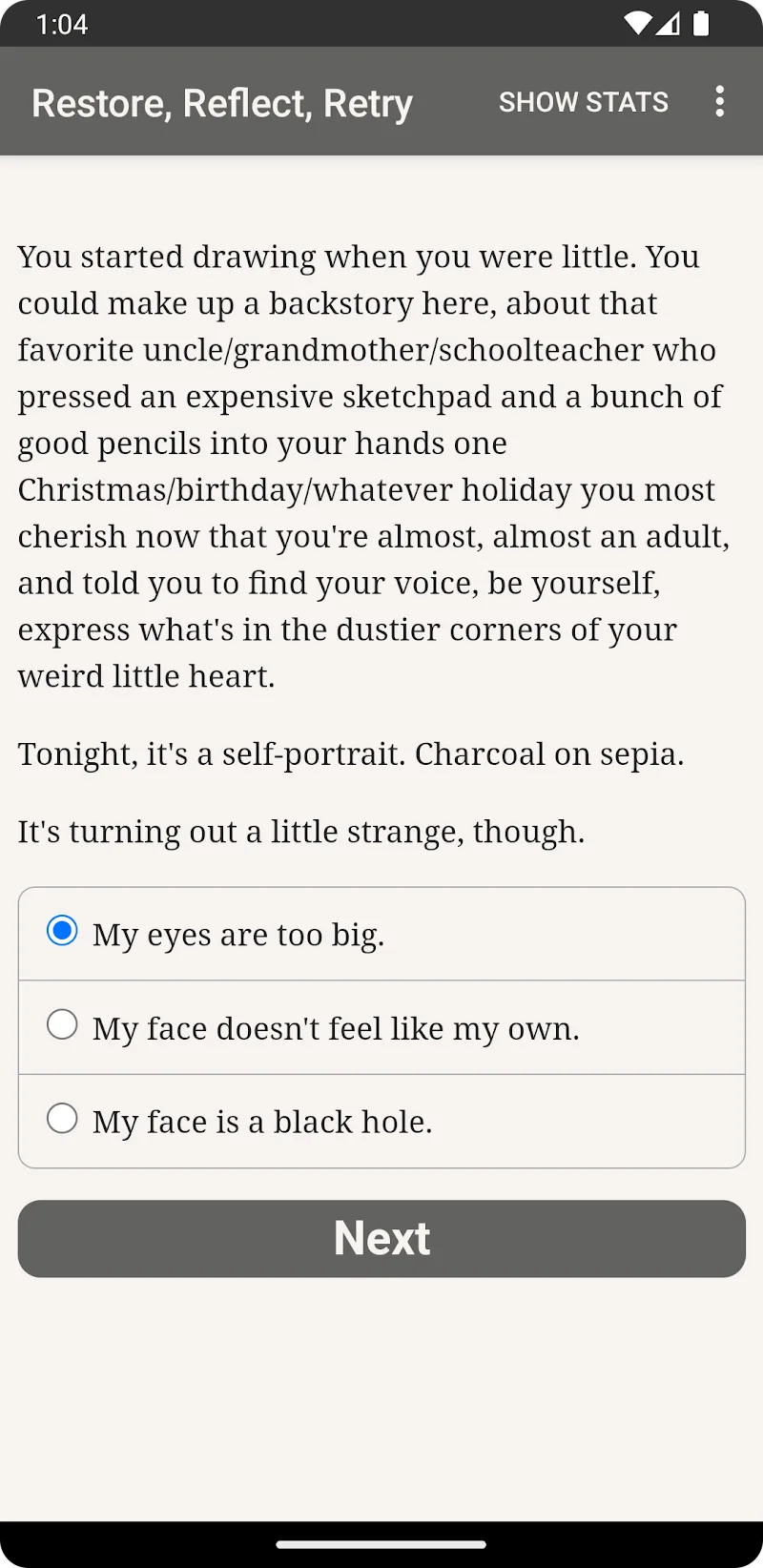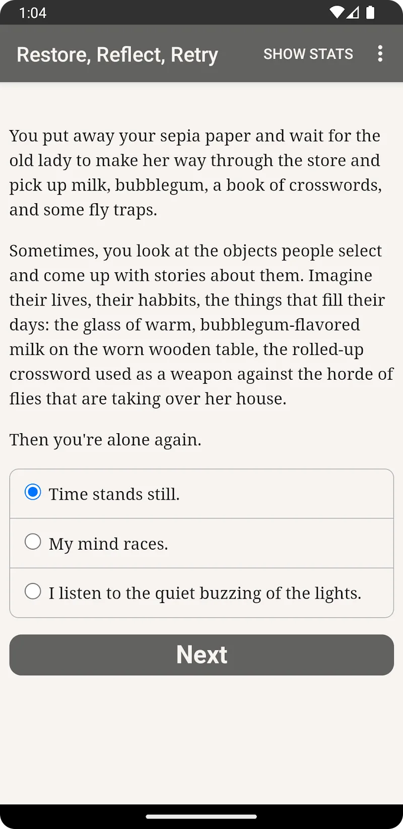 Restore, Reflect, Retry MOMD APK – Interactive horror novel about a haunting, mysterious game.Restore, Reflect, Retry is an interactive puzzle game based on a haunting horror novel by author Natalia Theodoridou. The game is completely text-based. Your job is to make the appropriate choices for the situations given in the game to reach the desired ending. Unlike other horror games, this game does not use images or sound effects. When participating in the game, you will feel caught up in your own imagination of the world.IMMERSIVE AND META-HORROR EXPERIENCEIn this