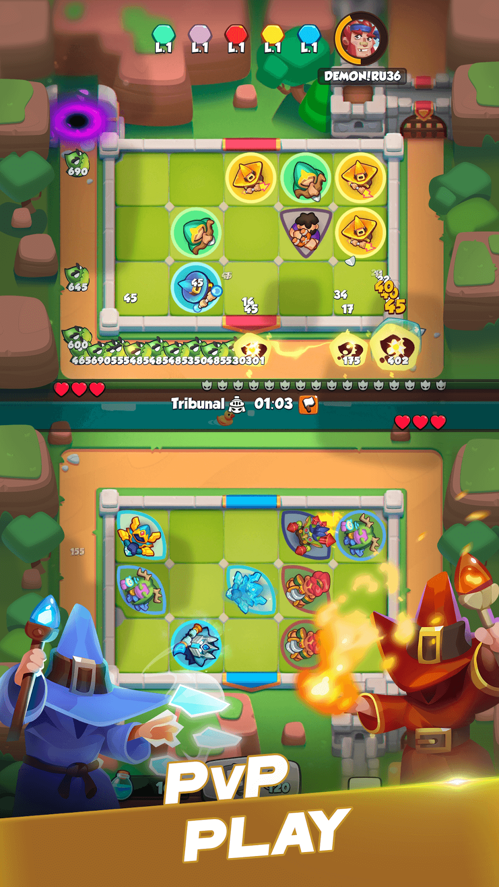 Rush Royale Mod Apk pportunity to explore more than 50 different playing units comfortably, and at the same time, you can freely build everything in the most majestic and solid way to protect its military zone.Hero Abilities: Become an excellent and brave hero who is always ready to move forward and knows how to solve problems in the most skillful and intelligent way.Strategy: Closely coordinate strategic units together and come up with the best gameplay while at the same time offering the safest defense measures for your team.COMPETITIVE PVP BATTLESPlayers will have the opportunity to experience intense and engaging PVP battles. Every character has unique fighting methods, giving players excitement and showing off their defeating abilities. Compete with every player to win this stage.PvP Competition: Face your opponents in battle with confidence and courage, and defeat them based on you