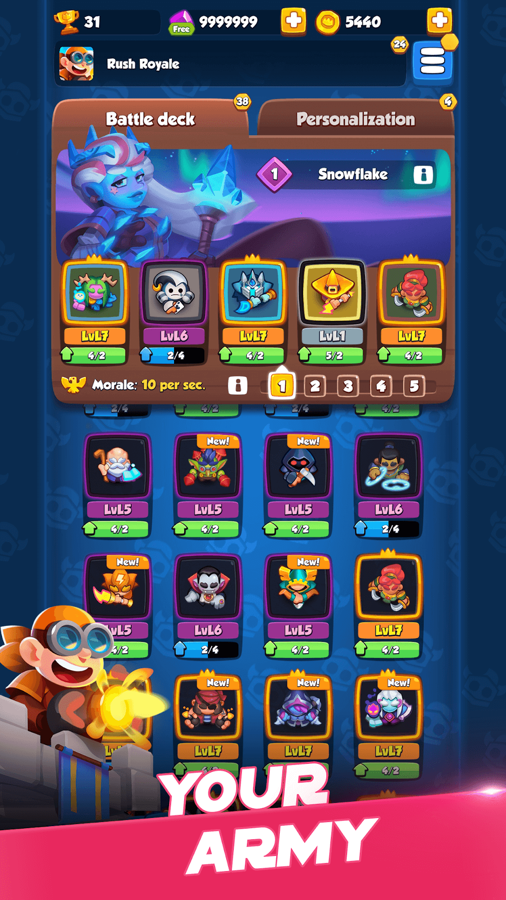 Rush Royale apk-en is extremely powerful, so coordinate your tower defenses together, face them and defeat them in the most powerful way.Loot Rewards: You will receive a series of unique loot that will be useful to you in the next matches.Bonding Experience: Through many levels of playing together, the camaraderie of all players will be much closer to each other.DEEP PROGRESSION AND CUSTOMIZATIONComplete assigned tasks every day to receive appropriate rewards. In addition, you will be promoted to higher levels if you pass any round.Unit Progression: Increase levels for all players and give more attractive gifts after passing a level.Daily Quests: Daily Quests: Experience the levels in a fun way and enjoy a great playing space with many unique levels and new rewards.Deck Customization: Players have the right to freely arrange their cards to experience more suitable and interesting gameplay.