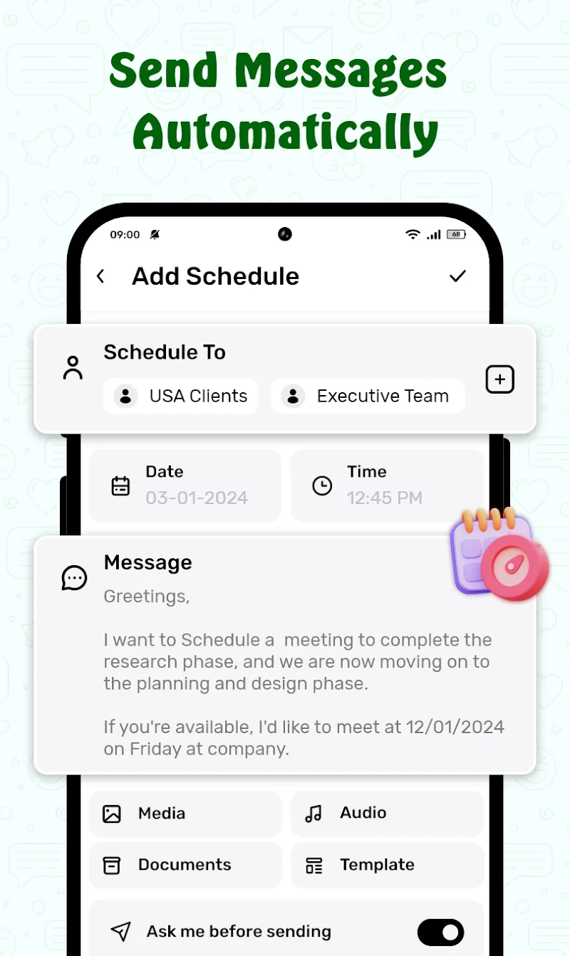 If you are looking for an automatic message reply application for your business or store, Message Scheduler for Business is the perfect choice for you. The application will bring you extremely useful features and tools so that you can reply to messages quickly and easily. What are you waiting for and thinking about without coming to this application right away?SMART MESSAGE SCHEDULINGWith this application, you will quickly be able to set up a message reply schedule. You can set up messages according to your usage and purpose, giving you extremely attractive and interesting experiences.Multi-platform support: The application will quickly support multiple platforms for you automatically. No matter what platform or application you use, the application can operate smoothly.Business-ready automation: With this application, you can run your business quickly and easily without having to do too many complicated or difficult operations.Time-saving setup: With this application, you will save a lot of time. You do not need to spend too much time replying to messages without encountering any difficulties or obstacles.INTELLIGENT AUTO RESPONSEThe application will bring you extremely intelligent response features. With this feature, you will quickly be able to reply to any message without having to worry about time issues, giving you the most convenient and versatile experience.24/7 replies: With this application, messages sent to you will always be replied to 24/7. Bringing you countless attractive and extremely convenient experiences.Customizable replies: The application allows you to set up and customize replies to suit your purposes and needs. Bringing you the most perfect messages when using.Boosts engagement: In this application, you will quickly be able to increase interaction for your business. Helping you to reach more customers and increase the frequency of replying to messages for your business.