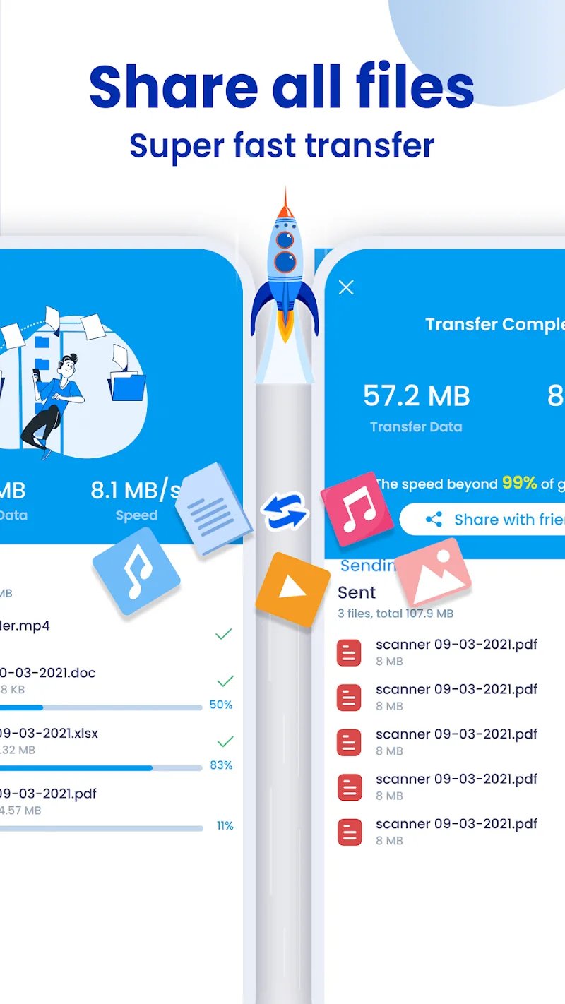 SHARE: Share it. File Transfer is an extremely convenient and handy application. You do not need to use a USB or connect to a computer to transfer data from your phone to your newly purchased phone. This application will support and connect the two phones together and transfer data to you in the fastest way.NO NETWORK NEEDED FOR FLASH TRANSFERYou do not need to use the Internet for this application. It does not require your device to have Internet access. You can use the application anywhere and anytime you want.Instant file sharing: You do not need to worry when you do not have internet or the network is too weak to use your phone, because the application can transfer all data extremely quickly, all data is in the device you want to transfer data to without having to use wifi or 4g.Cost-effective: The application will connect to your phone and automatically transfer all the data in your phone to another device. The application can transfer smoothly, and the transferred images and videos still retain extremely clear images without affecting their quality.Privacy and security: By transferring data via Bluetooth, you can be completely assured of the security of the application. It will prevent all your personal information from being stolen or your personal information being leaked.SHARE & TRANSFER ALL TYPES OF FILESThe application can also share and transfer all types of files with different formats without any problems or difficulties. You can transfer everything you want with this application.Versatility: You can transfer images, videos, or even a movie smoothly and quickly. You can transfer extremely heavy data to other devices quickly without interruption or lag.Original quality preservation: You can simultaneously send large format and high-resolution files without affecting the image quality of those files and ensure that you can still use the transferred content with extremely high quality.Convenience: Sharing has become easier when using this application. You can share movies and good music albums with your friends faster without the need for converters or other cumbersome and complicated operations.