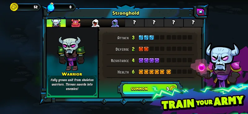 Skeleton Wars is a simple game where the mission is to collect resources to nurture and develop your undead town. With those same resources, you can create coins and mana to help you build, upgrade buildings and summon powerful heroes.Grow your town and unlock new buildings to build and strengthen your army. Each building and hero can be upgraded to prepare you for increasingly fierce attacks. Enemies will come in waves, your task is to protect your town and strategize wisely to use your heroes skillfully to overcome all the challenges!RESOURCE MININGIn the game Skeleto