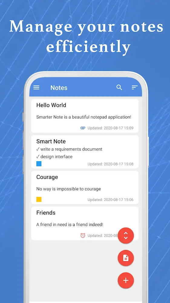 Smart Note Premium ted in the application is too large, you can use keywords to search the record made in just a few seconds quickly. The notification reminder feature will help you know the next task that needs to be done for the day.SECURITY AND ORGANIZATIONAL NOTESSmart Note stores all your changes in your device’s memory. To make the work of taking notes and reminding each day more fun, users can apply new wallpaper to the interface. The generated small shortcuts will appear on the screen for quick navigation to the content created by you. Because there is a large amount of important recording content, security is a top priority for the application. The user is allowed to activat