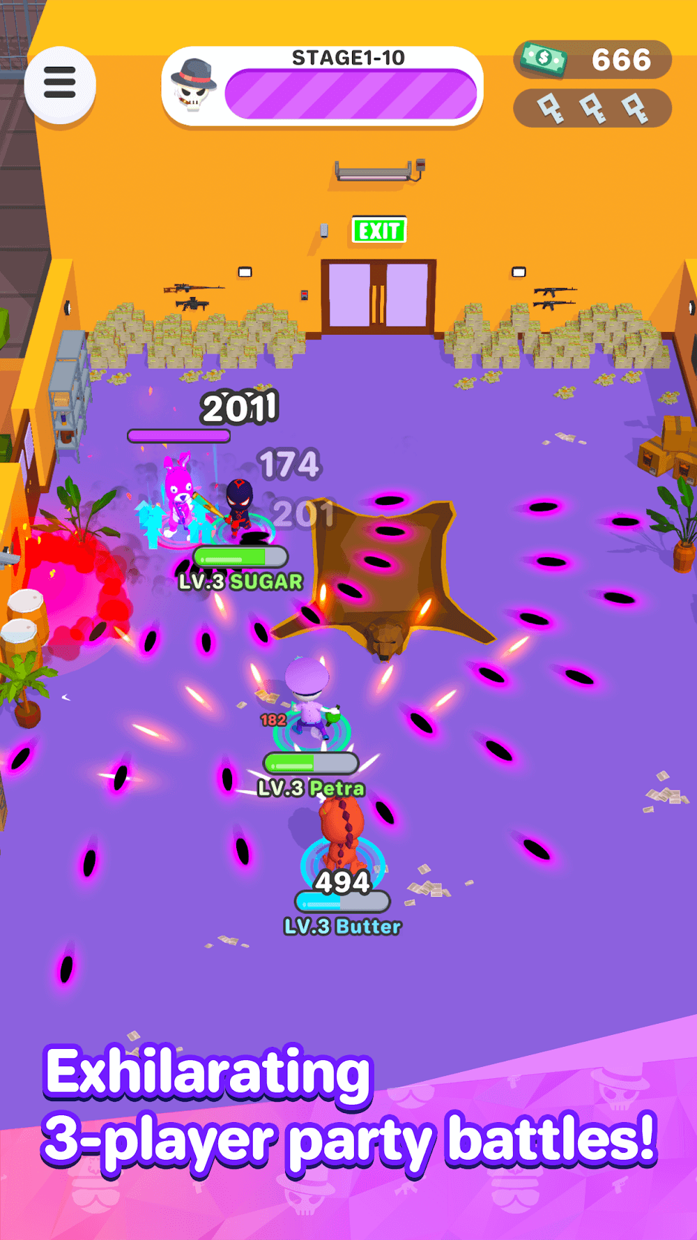 Smash Party 2 Premium eam of gangsters. Every hero and weapon is of a particular type, like Rare, Epic, or Legendary. You can collect weapons by opening the chest to get weapon cards, and those chests will be rewarded after completing each stage of levels. The difficulty of each stage increases, and initially, a single hero character fighting is possible; after that, three-player basics will unlock to form a strong unit to abolish the evil ones and bring back peace and calmful happy life to the citizens.In this exhil