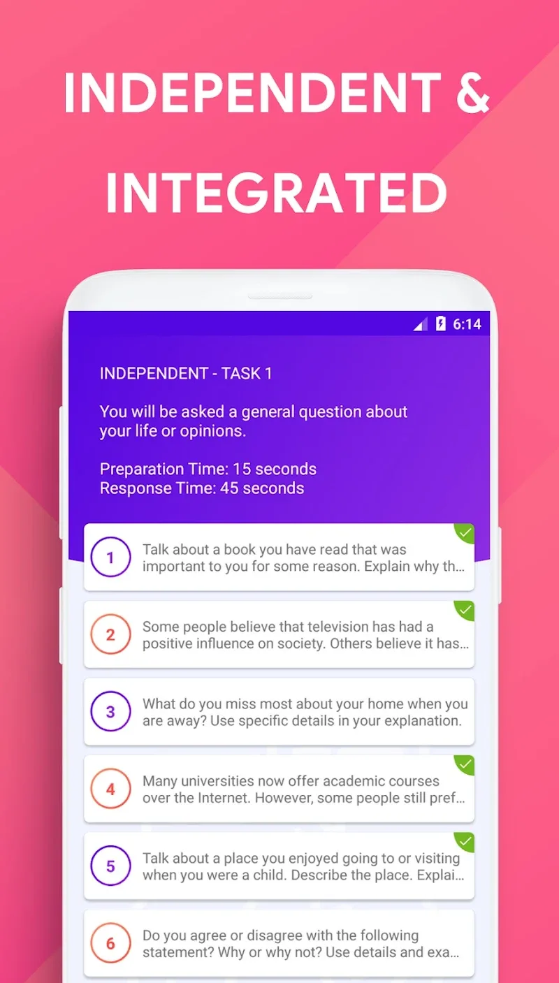 Speaking: TOEFL® Speaking is an extremely professional and perfect English learning app. With this app, you can learn English quickly and easily. The app will provide you with a learning path perfectly suited to your level. The most professional lessons will be provided, helping you improve your skills without needing to go to an English center. What are you waiting for? Download the app now!REAL TOEFL PRACTICEWith this app, you can study and practice TOEFL easily and simply. You can study anywhere and anytime you want, without any difficulties or limitations.Authentic Speaking Tasks: The app will provide you with real speaking practice exercises. Everyday topics will always be provided, helping you practice and communicate easily. It offers you extremely engaging and enjoyable learning moments.Exam Style Timer: This app offers incredibly engaging quizzes. These quizzes are 99% realistic, simulating real exams and providing a serious and focused learning experience.Sample Answer Access: This app also provides suggestions and sample answers, offering a wide variety of easy-to-use options.GRAMMAR VOCAB MASTERYThis app allows you to quickly and easily master grammar and vocabulary. It introduces new vocabulary and grammar points daily, providing an extensive and endless vocabulary base.Structured Level System: This app features a highly engaging hierarchical system, offering diverse levels from basic to advanced. It helps you quickly and easily improve your learning level.Extensive Practice Bank: The application provides you with an extremely rich and diverse practice bank. You will always have exercises to practice and learn without any limitations or difficulties. It offers you an extremely engaging and dynamic experience.Clear Answer Explanations: You will also quickly receive correct answers immediately after you complete your exercises and tests. With this feature, you will know your mistakes right away without having to wait too long.