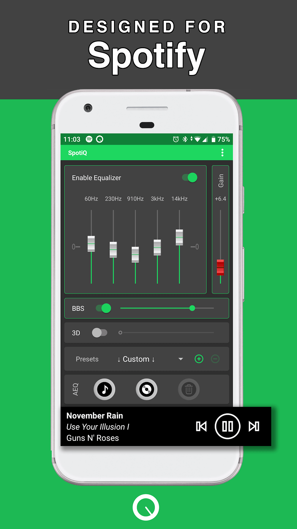 Spotiq Equalizer Bass Booster Premium Here’s how to put it to use: You must first install and run the audio equalizer application. After that, sync it with Spotify so you can use the built-in music equalizer. After synchronization is complete, users must choose sound presets or create new preset music using the Graphic Eq and Sliders. Last but not least, there is no time limit on how long you can listen to music on your device.SpotiQ’s audio equalizer app has a straightforward user interface and user experience. Users