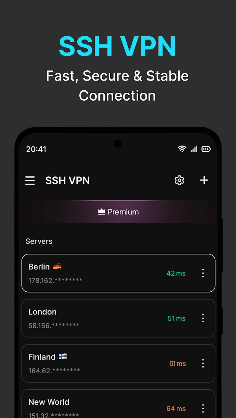 Ssh Vpn Client For Ssh Premium rs is their private information. The application will not save history to create a safe enough space for users to experience.USER-FRIENDLY & EFFICIENTThe application brings a new and high-end experience space. Users interact with a minimalist interface containing clear features. They also do not need to log in and provide any information, but still have a great experience. The application will not consume too much RAM for its operation.Minimalist Easy Interface: Users will easily interact with commands and buttons in the application. The interface is designed in a minimalist style with a few characteristic color