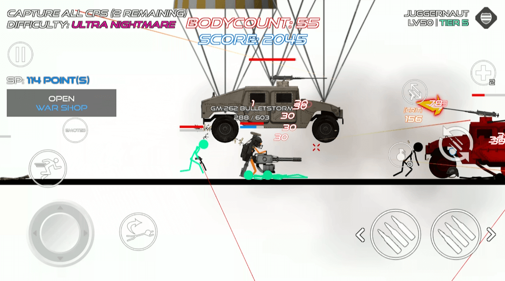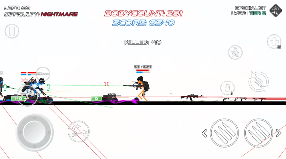 Stick Warfare Blood Strike Mod Apk ur reward. 2D environments often move more conveniently than 3D, which requires your skill.The action is fast-paced: Everything can be done in a pinch to win.Control from basic to advanced: With the initial operations, you will quickly become familiar with the control mechanism.Hundreds of powerful weapons: Players will access the game’s arsenal and admire powerful guns.ONLINE MULTIPLAYERPlayers will control the character with two hands because the control feature is often divided into two areas. The left area is the area where the character moves and performs acrobatics, such as moving left to right, jumping forward, or lowering his body to surprise the opponent. In particular, on the right side are two buttons that help you regulate the number of bullets fired. You can shoot enemies continuously and realize how many bullets are needed to kill them because the number of bullets you can use will be limited.Play with friends: Overco