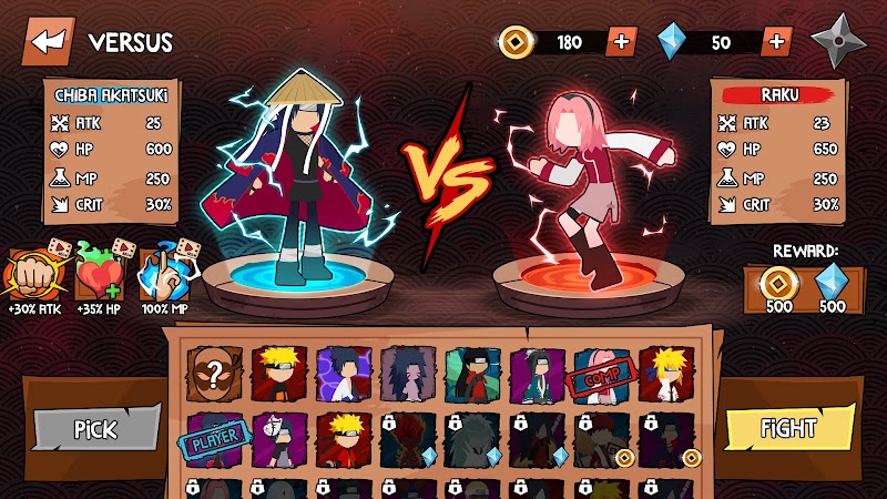 Stickman Ninja Fight Premium th and mana bars, not only your own but also the opponents. You or your opponent will be eliminated if either has zero stats. While the player is down, a health recovery button can be pressed. You can help yourself regain health so that you can continue fighting, but you cannot use them at any time. Winning players will receive additional rewards as well as new hero cards.TAKE PART IN EXCITING BATTLESStickman Ninja Fight players will start with a small team of ninjas. As you might expect, this collection includes many of your favorite Naruto characters. Each playable character will have unique skills, so choosing the right equipment to aid you in battle will be crucial. You are about to battle with many enemies