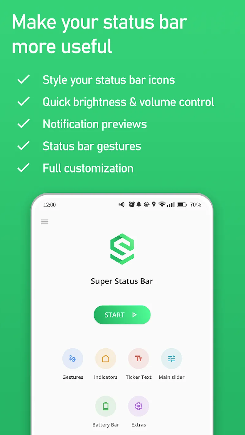 Super Status Bar MOD APK – Customizable status bar tweaks for enhanced functionality and style options.Have you ever felt that the status bar on your Android phone is too monotonous and lacking in personality? Want to change its look and feel to suit your own preferences and style? Then, Super Status Bar – Customize is the app for you!STATUS BAR BRIGHTNESS & VOLUME CONTROLThis feature allows users to adjust screen brightness and volume directly by sliding on the status bar of the screen. This saves a lot of time since adjusting screen brightness and volume needs not to involve some kind of