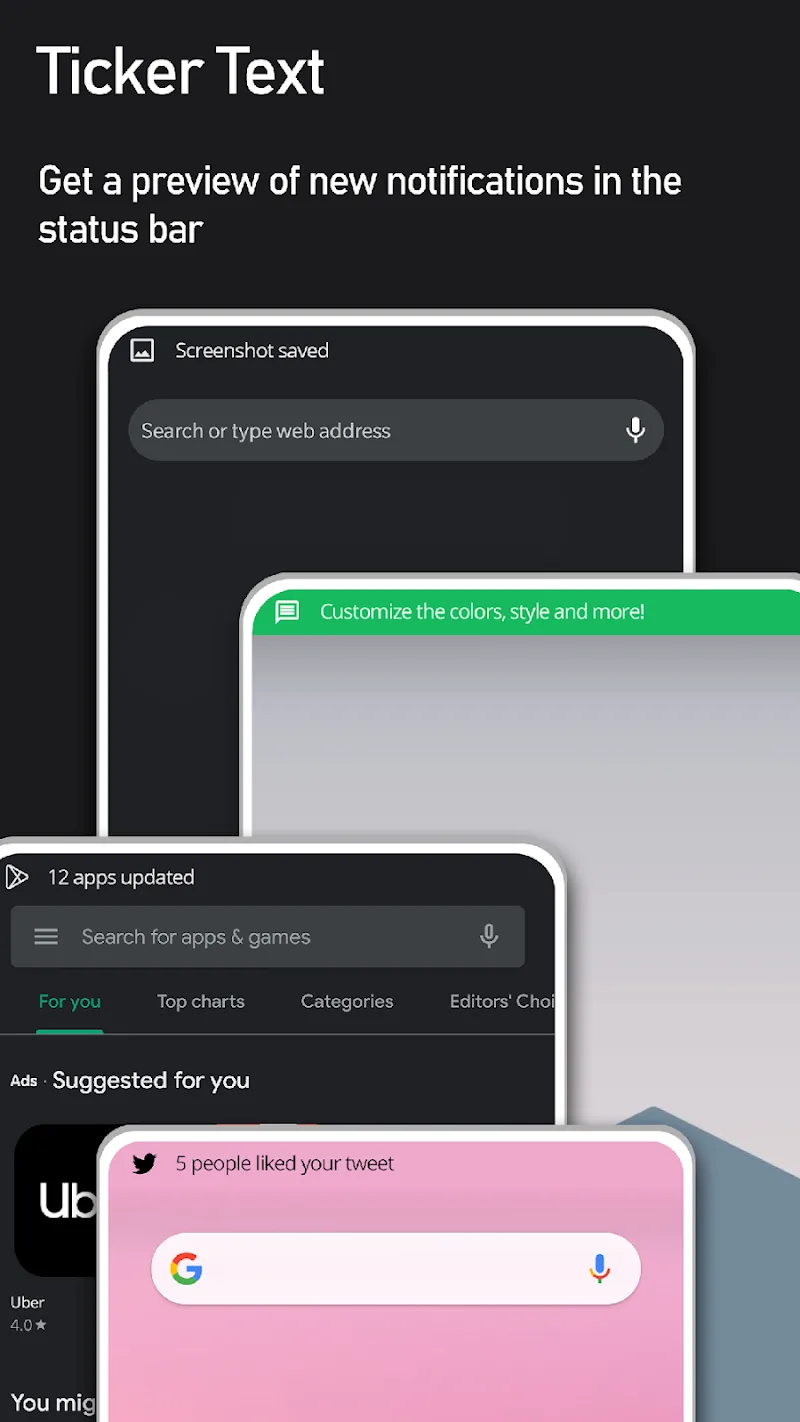 Super Status Bar Premium music, calls, ensuring you always have perfect control over every audio element on the device.STATUS BAR NOTIFICATION TICKER TEXTThe app restores the text ticker notification feature into the status bar for smooth and non-disturbing notifications. As you get new notifications, its brief content will show according to the moving text on the status bar to let you concentrate on your work but not miss the important news. This works out quite well, especially when you do not want the screen to be fully filled with notifications.Unobtrusive notifications: With the return of the “notification tick