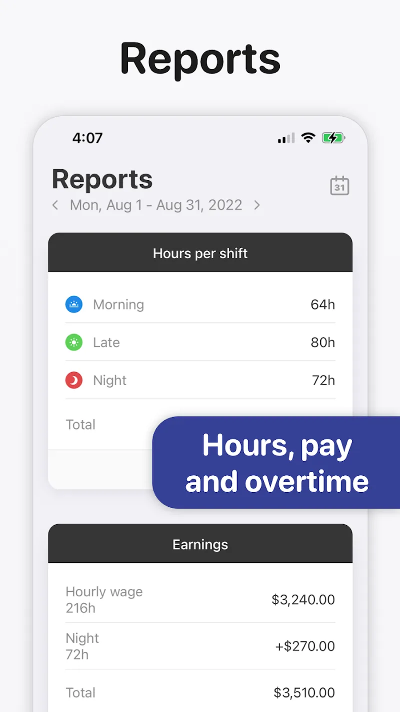Adding shifts to the calendar is well optimized when users try Supershift – Shift Calendar. Each person can follow a certain style based on the corresponding customization features. From there, the variety of information can be stored and protected in the most careful way to maintain work efficiency.SMART SHIFT MANAGEMENTIf you are a part-time worker, Supershift – Shift Calendar becomes a suitable choice. This is completely understandable when managing your work makes you less stressed in many ways.Customizable Scheduling: Many people can quickly add multiple shifts per day in many different ways. Specifically, they will often create characteristic styles with different colors attached to the icons.Shift Rotation Planning: Over time, setting up work features can be quickly re-operated. This is completely understandable because many people often do one job for many years.Reports & Tracking: In addition to managing the huge workload, the system also helps you track the amount of money you can receive. From there, trips can be carefully planned through the available calendar.SEAMLESS INTEGRATIONFeatures related to dates often have certain connections that you can take advantage of. This is especially true with Supershift – Shift Calendar when converting information to other platforms.Calendar Sync: The system supports converting exported information easily to features of the same type. Therefore, Google or Outlook tools become the ideal destination for this information.PDF Export: All information can become extremely detailed from your current perspective with just a few adjustments. Of course, retrieving them is often done for use in environments without internet.Cloud Backup: Backing up information is not a new concept but is absolutely necessary in many different situations. At the same time, you do not want to set up from scratch after buying a new device.