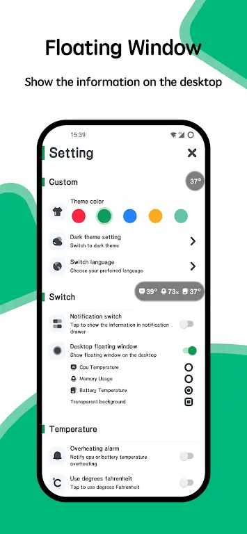 System Monitor Cpu Ram Battery Premium ntelligent overheating alert. This alarm function is adaptable to your own needs and preferences. Trustworthy overheating prevention protects your gadget from malfunction and extends its life.FLOATING WINDOW: A BREEZE TO USE FOR REAL-TIME TRACKINGEnvision can see critical data regarding your device’s performance without leaving any other app. This is made possible by the floatable window functionality of System Monitor CPU RAM Battery. It’s easy to monitor your computer’s health without stopping what you’re doing, thanks to the floating window that shows you data like CPU temperature, battery temperature, and RAM utilization in real time. It’s like always having access to your performance dashboard.THE CONVENIENCE OF A WIDGET RIGHT ON YOUR HOME SCREENThe System Monitor CPU RAM Battery widgets provide easy access to frequently used performance indicators. You can keep tabs on your device’s memory, processing speed, and battery life using widgets designed specifically for that purpose. With just a look, you ma
