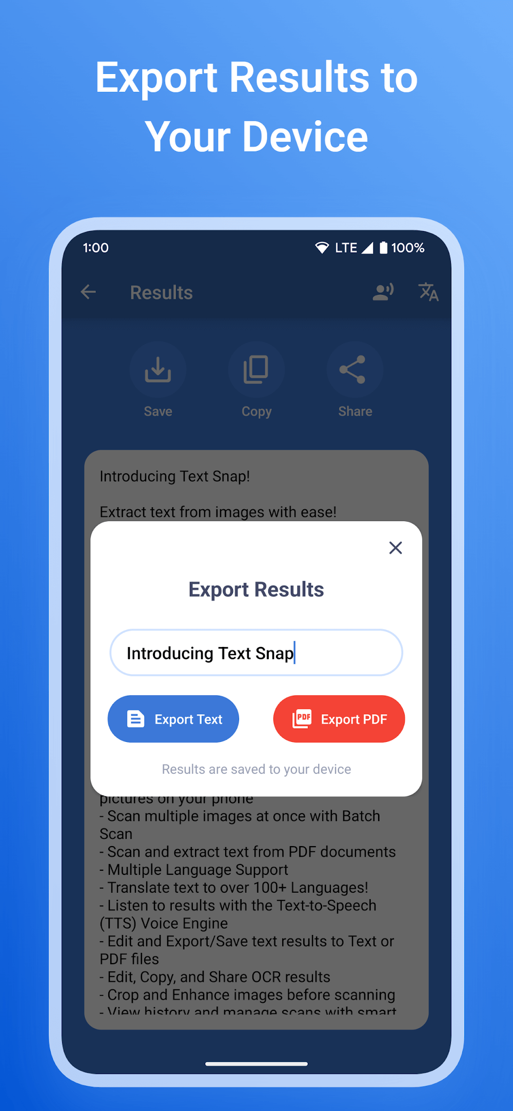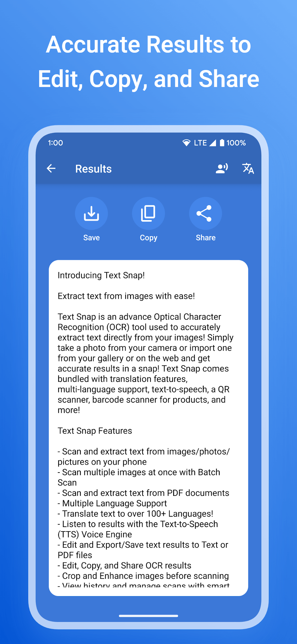 Text Snap Image To Text Premium APP HAS A DOCUMENT AND IMAGE SAVER, BARCODE, AND QR CODE SCANNER.Additionally, Text Snap can convert text into over a hundred other languages. In addition, the TTS Voice Engine allows you to listen to the outcomes rather than read them. And if you need to make changes, make copies, or share your OCR results, you can easily do all that using Text Snap. Not only that, but Text Snap lets you edit photographs before scanning for optimal quality by cropping and enhancing them. Text Snap is a convenient all-in-one solution because it can read barcodes and QR codes.SPACE-SAVING GENIUS CAN COPY TO TE
