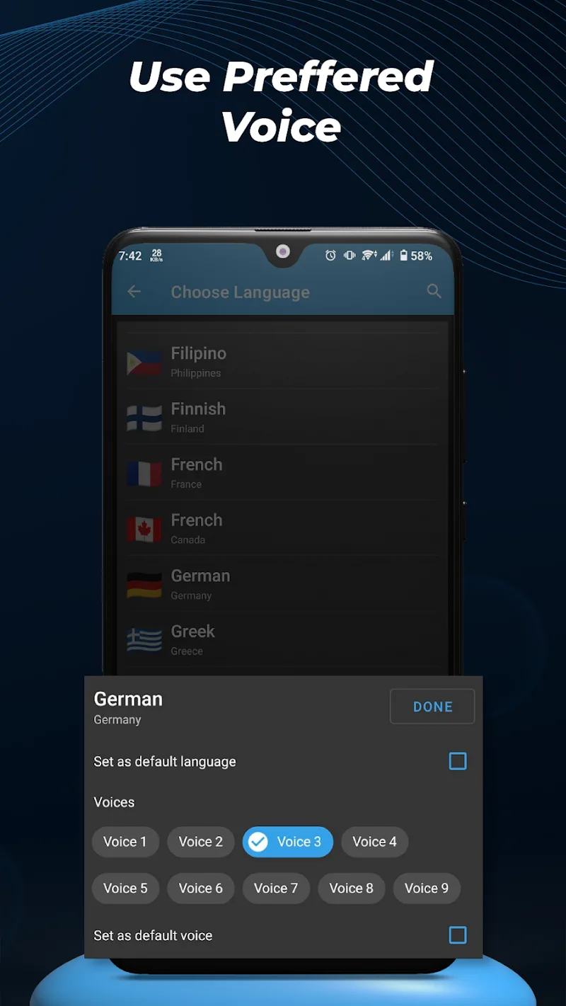 Text To Speech Tts Premium ty audio files. The app lets users adjust different parts of the audio, like volume, speed, and pitch. The voice can be tailored to match the user’s desired tone for a better sound.EXTENSIVE LANGUAGE SUPPORTThe app supports many languages, making the conversion process easier. Users can convert text directly from files. They can use a professional and flexible conversion system. The text-to-speech process uses very natural-sounding voices.Over Fifty Languages: The app helps users convert text to speech in more than fi