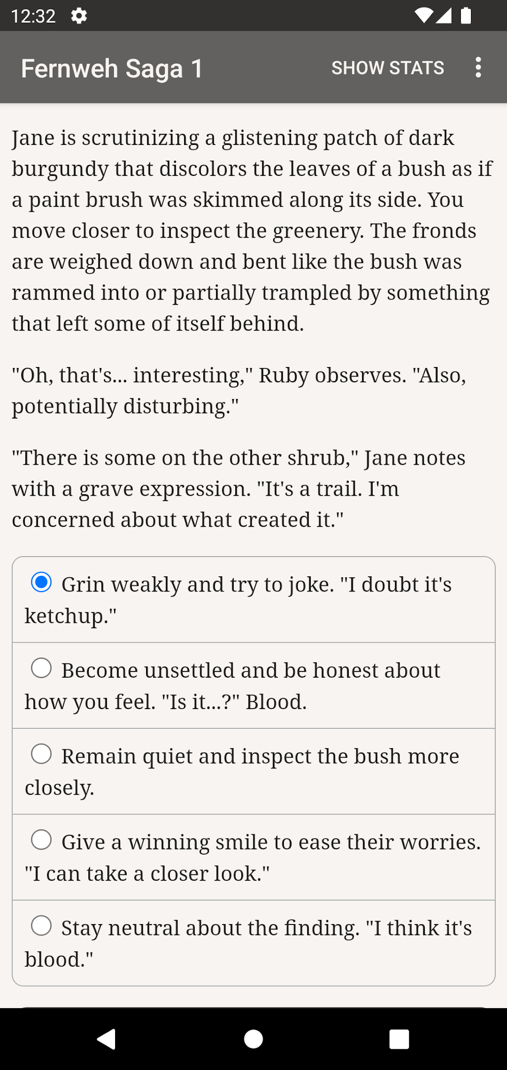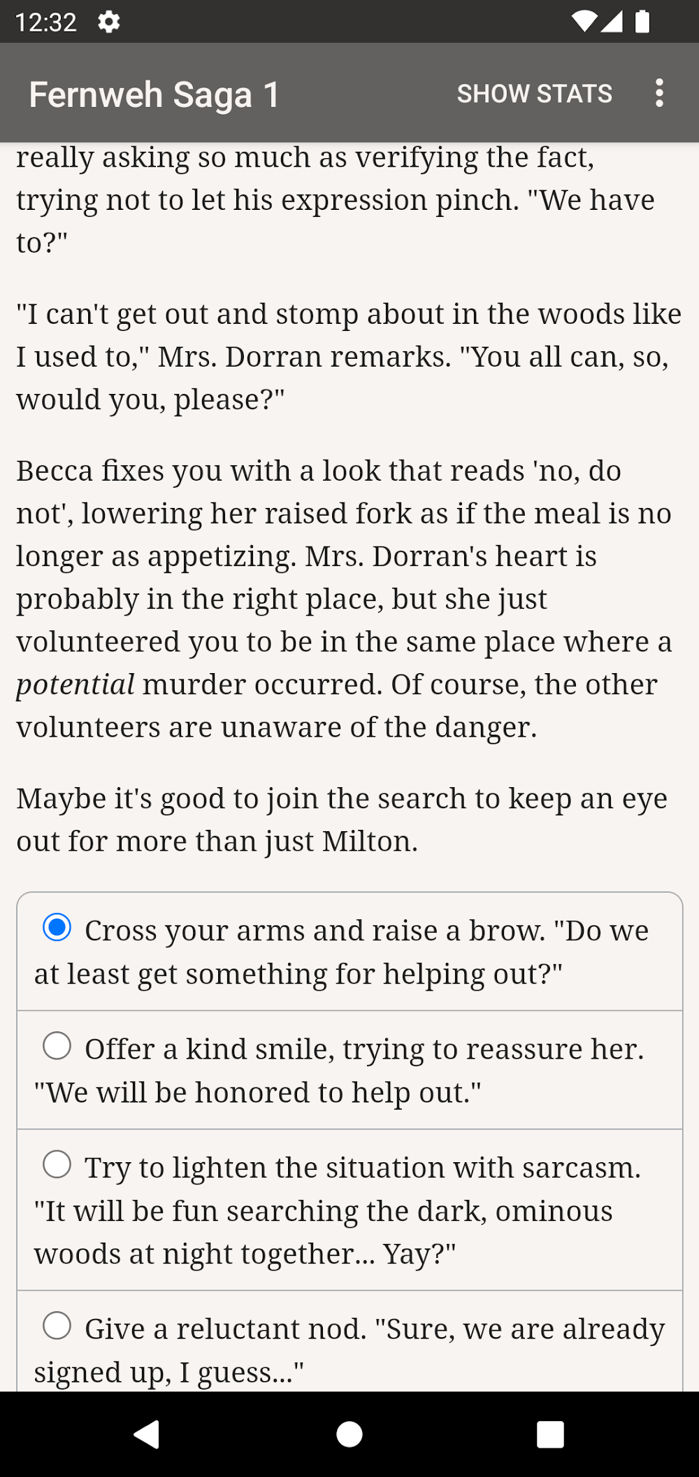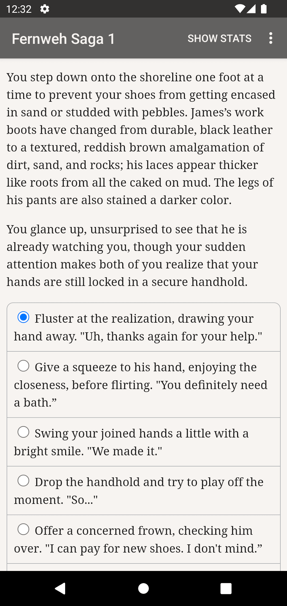 The Fernweh Saga Book One apk-en -filled interface and no effects. This ensures that you will focus on the content and not be bothered by other factors. In particular, the character always owns a stat at a neutral level. New events will appear right after that and require you to make a choice. Your stats change, and sometimes, you should review them before continuing with a new event. They are often related to strength, traits, etc. So, you can be a warm person or a highly strategic person.