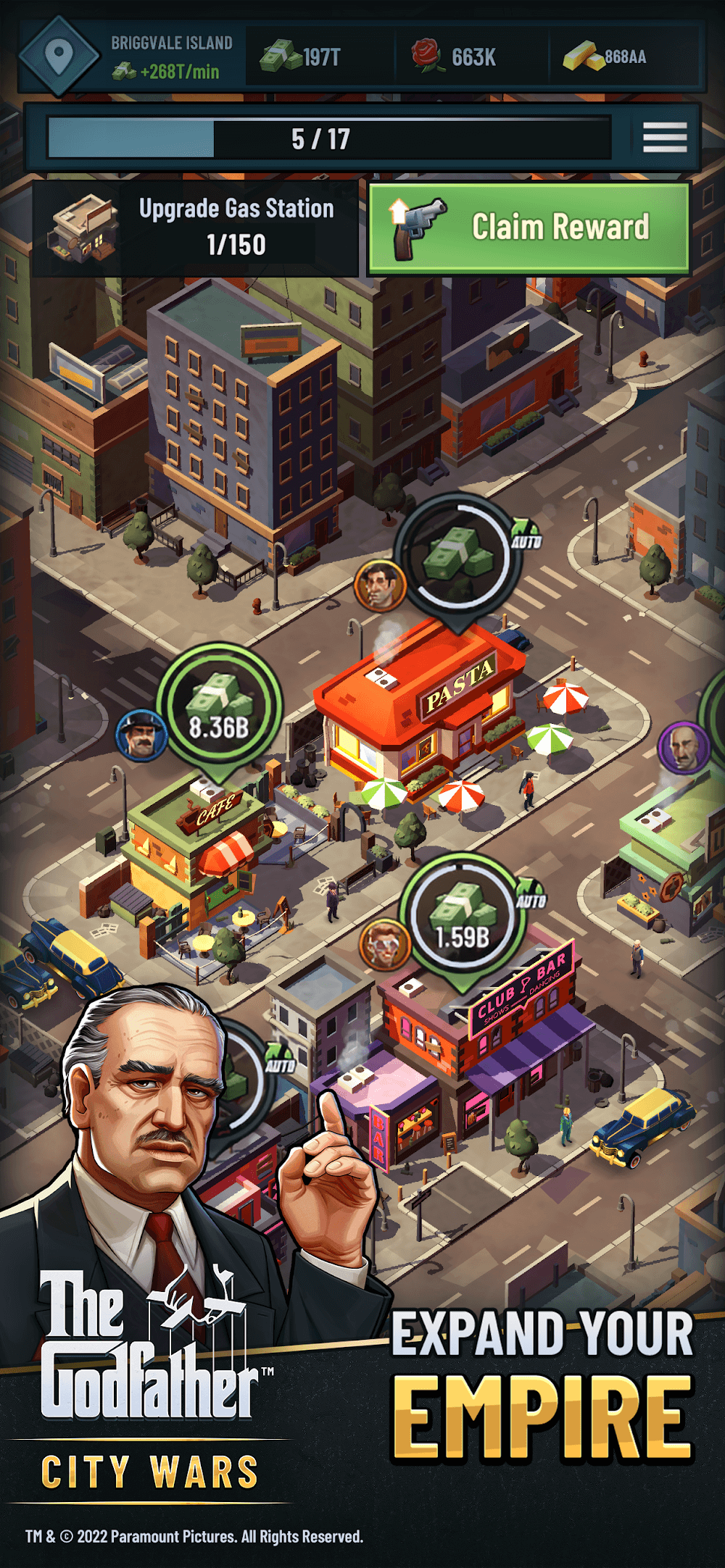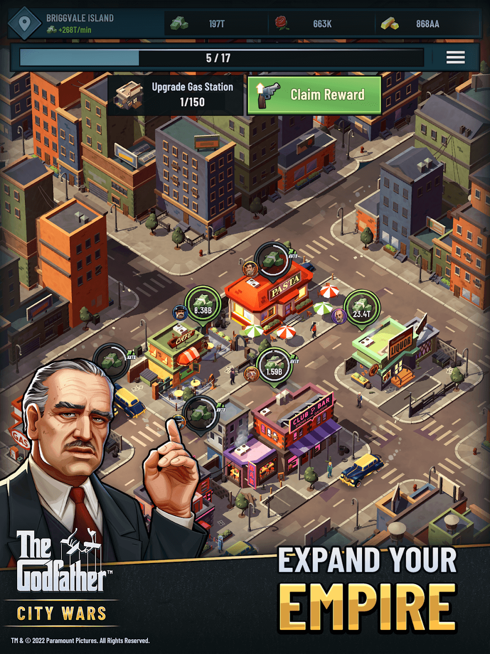 The Godfather City Wars apk-en . You will also gain more profits and power when your city becomes stronger and develops, bringing you extremely interesting and attractive gameplay that you cannot find in other games.Automated Income Growth: Your life will never lack money, because the sources of income in the city will automatically flow into your pocket, from small to large businesses, from legal to illegal money, all are brought to you, whether you are in the game or not, bringing you an extremely huge fortune.