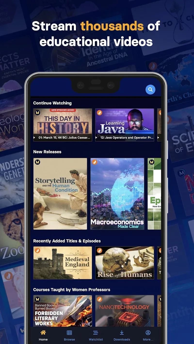 Wondrium MOD APK – Unlock your potential with expert-led online courses covering diverse subjects. Learn, grow, explore!If you are looking for an application that has a full range of online courses, The Great Courses Plus will fully meet your requirements. The application will bring you educational videos with a variety of rich learning topics. These videos and courses are all instructed by experts and are extremely carefully censored. Coming to this application, you can study anywhere and anytime you want, most easily. What are you waiting for? Start studying now.EXPERT-LED COURSESComing to this application, you will own learning videos from leading experts. These videos will bring you accurate knowledge and extremely attractive lectures that will make you feel excited and just want to study forever.Learn from instructors: The videos and learning materials are taken from and referenced by the world’s leading instructors, giving you the most accurate and in-depth knowledge that no other learning application can provide.High-quality content available: The learning videos all have extremely high sound and image quality. You will have videos with sharp images and clear sound, helping you learn quickly and easily without encountering any difficulties or obstacles.FLEXIBLE LEARNINGYou can take the initiative in your study time with this application. The application will not restrict your study time and you can study whenever you are free, giving you the most flexible and effective study schedule.Learn at your own pace: You can choose courses according to your level. With this feature, you can learn quickly and easily with lessons that are extremely suitable for your level and ability to absorb, giving you an extremely perfect learning experience and making progress every day.Explore various topics: The application will also bring you a variety of rich and diverse learning topics, from science to literature to mathematics and other unique topics. Bringing you the most diverse choices to you and you can choose the topics you love to learn.