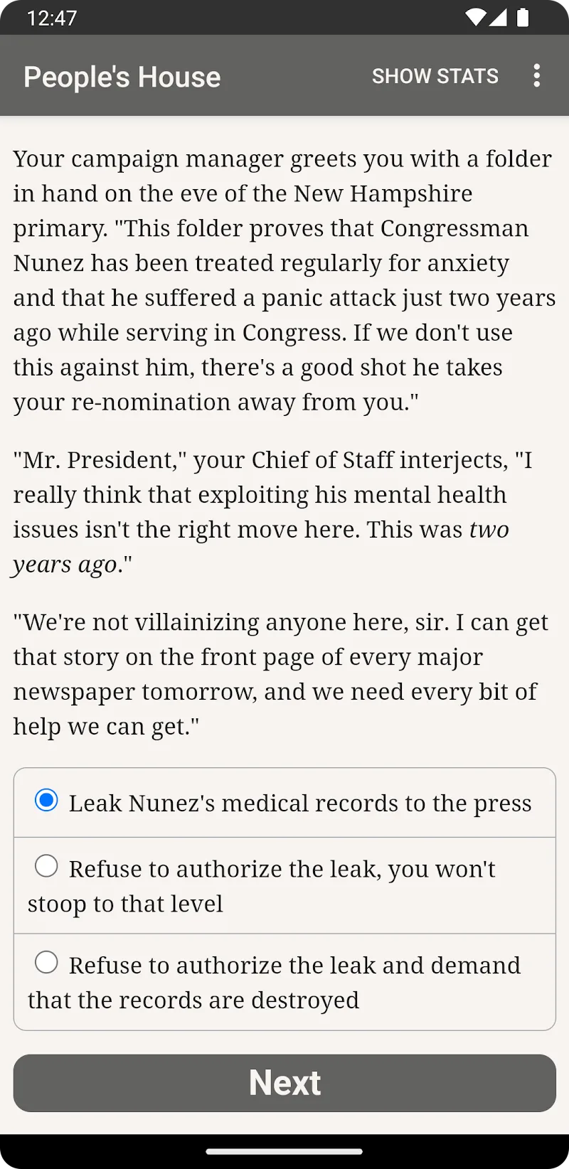 The Peoples House Mod Apk images or sounds. Your imagination can fill everything. It makes the player feel like he is participating in a psychological novel. As mentioned, the pressure of leading a country is huge. Any mistake in decisions will cause the player to cause the entire country to collapse.Unique Playthroughs: The story in the game will not have any fixed development. People have many strange opinions. They can be reasonable or unreasonable. Whether you agree with them or not will lead the story in a completely different direction.Deep Intrigue: