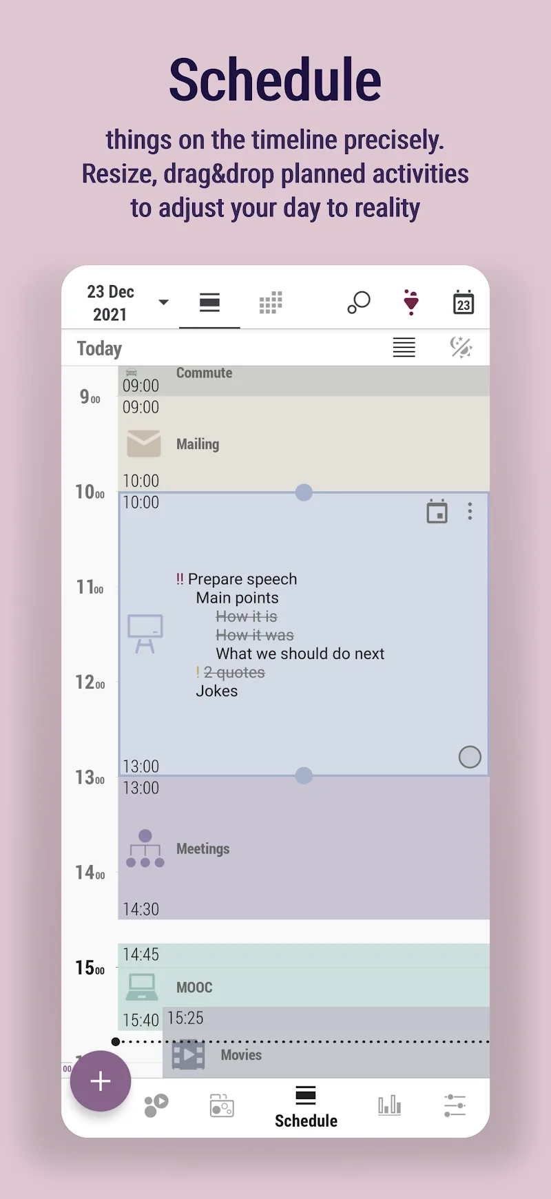 Time Planner Mod Apk ny different factors.Fast and Optimized: Users can see the tasks that need to be done with just a few basic looks. At the same time, they are often linked together and shown on the set time axis.Convenient Schedule: With a large number of tasks, you should try to observe it as a timeline or a part of the day. This will help you avoid the pressure of doing them all.Easy Time Tracking: Bubbles are often a supporting feature