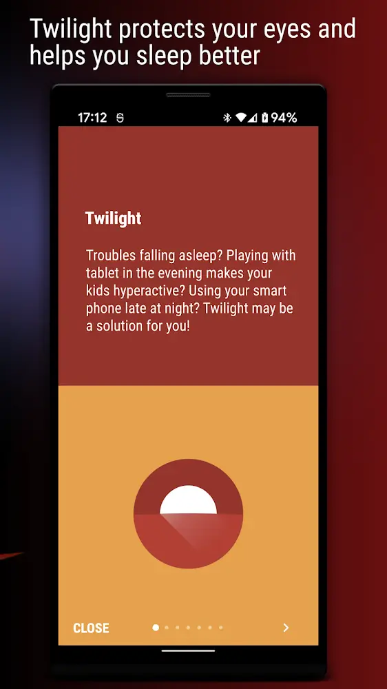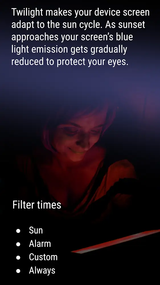 Twilight is the most effective application to help users sleep well so far and has received good feedback from many users. For those who are having insomnia and cannot fall asleep, this application is the solution to help you have a great sleep. Many experts and users who moderate the application can use it as a sleep aid. In particular, the application is wonderfully combined with the red light system to reduce blue light and harmonize the user’s eyes.USE LIGHT TO TREAT YOUR EYES EFFECTIVELYCurrently, many users tend to use the phone until late at night and gradually become a habit of not being able to sleep on time and sleep well. It is this factor that brings many unwanted effects to users. Therefore, Twilight has launched to help users use it as a tool for you to regulate sleep better. When you use your phone at night, the application will directly convert red light into the screen instead of blue light as usual, which will keep your eyes awake and not sleep. This red light has stimulated the production of melatonin and improved insomnia exceptionally effectively.ENJOY EFFECTIVE SLEEPBesides the application to protect the eyes and also the function to bring about adequate sleep. The application has been very clever in creating sounds so that users can sleep. However, users can choose the nature sounds they like to listen to in times of need. These sounds also bring a lot of positive energy to energize you as well as ensure better health. Therefore, the appearance of eye protection applications such as this application serves as useful solutions to help users of technology devices partly reduce the harmful effects of these threats.LIGHT FILTER SYSTEMIn addition, this application also has a very special function which is to use the light filtering system on mobile devices. If you are using your phone at night, the application will immediately change the light color to make your eyes softer and easier to adjust. Because, at night, you use blue light will keep your eyes awake and unable to sleep. However, users can turn it off when not needed. Besides, users can effectively use this light system to read books at night.If you are a frequent insomniac and have trouble getting enough sleep, you should use this app to help you improve your sleep. Installation of this application will make you extremely effective in sleep regulation for those who often use it late at night. At the same time, the application is integrated with outstanding features to help filter light and let users use it comfortably.