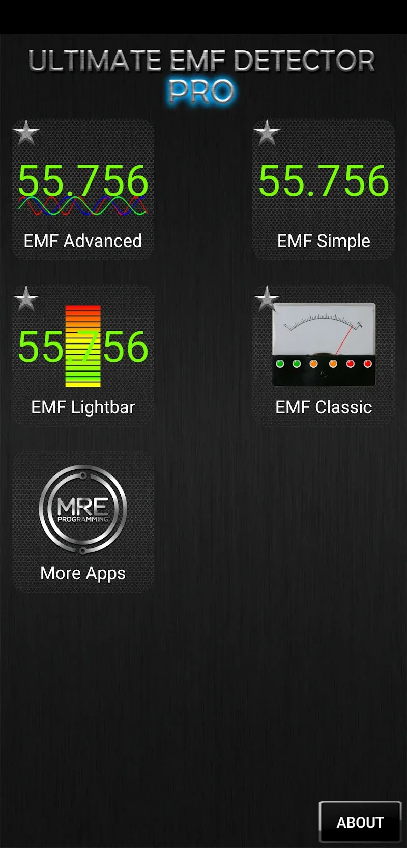 Ultimate Emf Detector Real Pro apk-en nced EMF Meter is used to measure sound and vibration. The Simple EMF Meter will perform the simplest measurements. The application also provides the Lightbar EMF Meter with more advanced measurement features. Finally, the Classic EMF Meter with measurements dedicated to classic devices will meet most of the user’s requirements.Various Backgrounds Skins: The application’s interface can change depending on the detector mode selected by the user. Multiple background interface styles will be announced during the user’s use of the application. Special interfaces dedicated to detector types will help users distinguish between types of devices easily.