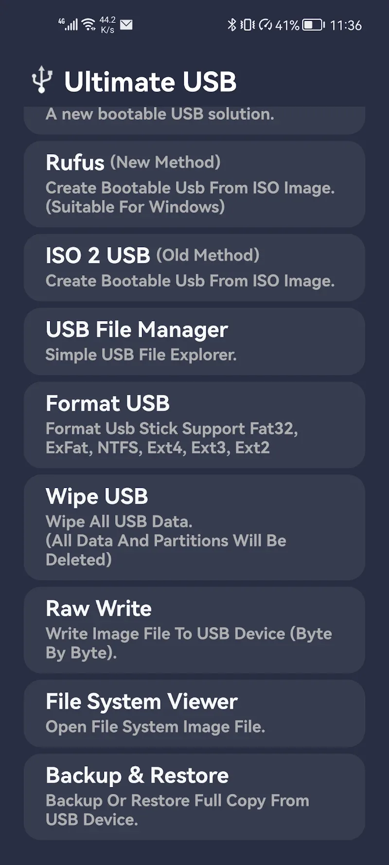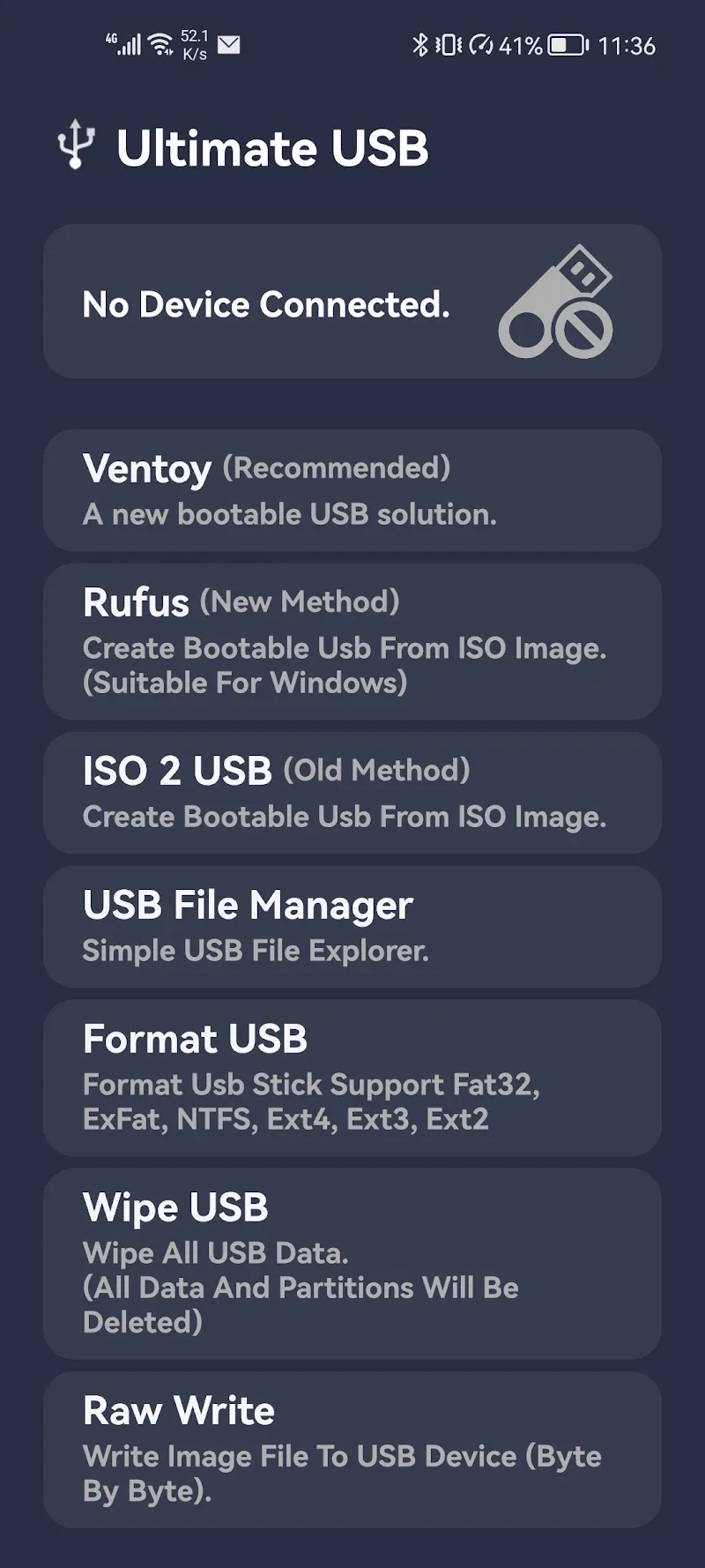 Ultimate USB Mod Apk – Your All-In-One Toolbox for USB Management and Operations with Unbeatable Versatility.Ultimate USB is an application that can turn any USB into a place to store information about the Windows operating system for installation on a PC. The operation is completely simple thanks to the features being displayed clearly and helping users understand the features of each tab. In particular, USB information management is absolutely necessary before users use it and add any data to it. If you do not feel confident with your skills or are afraid of losing important files on your USB, the backup and restore feature will help you quickly.VENTOY (UNOFFICIAL)Ultimate USB is an optimal solution for a day when Windows on your computer is having problems and you cannot use it. From there, you will have to reinstall the operating system and need a USB boot, so this application can turn any USB into a Windows boot tool without a PC. In simple words, users can take any USB; from there, the data to install Windows on the PC can be put there in just a few steps. Of course, it can be done by many people whether you are into technology much or not. Just follow the videos available online, and you can complete this task and feel superior when you have an achievement of your own.Hold multiple files at once: Through useful features, handling multiple selections is something that should be appreciated.Easy to use: The interface allows users to automatically add or remove unnecessary ISOs without using multiple USBs.RUFUSUltimate USB is completely simple to make, and there have been many videos made on the subject, so it is entirely possible for you to complete it. The first and most important job is to prepare a conversion port so that the USB you have can connect to a smartphone or tablet. After that, you should download a file containing operating system information to your device and then perform all the processes that the videos instruct. You will find that everything becomes surprisingly easy, and you will feel, if only for a moment, that you are an expert in installing operating systems. After adding information to the USB, you just need to use it to plug into your PC to install the operating system.Simple, easy-to-use interface: Even though you don’t know what a USB drive is, you can still rest assured to take advantage of its full potential.Supports most different files: The application creates good compatibility with ISO formats, Windows, and many other platforms.ISO2USBThrough the main features of Ultimate USB, users can see that its advanced features can completely cause difficulties for themselves. But when you access it, this feeling completely disappears. Specifically, users are completely impressed with the interface, which has simple colors where corresponding features are gathered along with small notes below. The point that makes users afraid when coming into contact with technical-related applications is that there is a lot of information, and they don’t know what they will find next. Therefore, when you come to this application, you will know what you need to do and which features are suitable for you to choose.Does not require device capacity: Although the application needs to process some important files, it still does not take up available resources.Create ISO files quickly: With the help of fast writing features, a suitable program will be created.FILE SYSTEM FORMATTINGThanks to the feature tabs being completely clearly divided and visible to anyone, users can manage what is on the USB. Before performing the installation, you will definitely need to check the parameters and elements included. If they are important files, you should consider storing them or finding another more suitable USB. The USB folders will also be shown completely clearly so you can check in detail and quickly before installing boot files for Windows.Supports many different supports: Many installed drives can operate stably and ensure compatibility with your USB.Easy customization: With just a small operation, all adjustment information can be done quickly.WIPE USB TOOLA notable point when users use the application is that it can allow you to back up what is on the USB device you are using. This information can be saved if it is absolutely important in the Android device for some time. After the boot process is complete, you can transfer it back to the original location or push it to a new USB. From there, you can be completely assured that important files will not disappear, and you can still ensure that you can boot Windows with the USB you are using. Therefore, this application satisfies everything users need.Wipe information: Once the user has agreed to delete stored items, nothing can be retained.Confirmed safety: Through extremely thorough data processing, you can do other things with peace of mind.