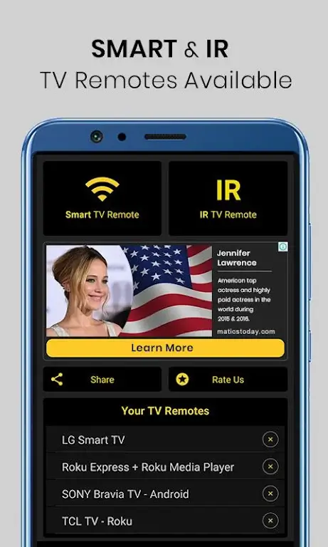 Universal Tv Remote Control apk-en ists or difficult user interfaces. It’s time for simple control.REVOLUTIONARY FOR INFRARED TVSInfrared TV owners may relax. The Universal TV Remote Control app’s infrared capability is built-in. You can transform your phone into a powerful universal remote control by sending signals to your TV like a standard remote. Your phone controls everything from station switching to volume adjustment.SUPERIOR ASSISTANCE FOR ALL USERSThis breakthrough app’s developers, CodeMatics, prioritize your satisfaction. They worked hard to build a clear, intuitive UI that satisfies all your needs and simplifies your experience. They continue. If your TV brand isn’t mentioned or you have compatibility issues, their dedicated customer service team is just an email away. They need to know your TV model and remote to make the app work.