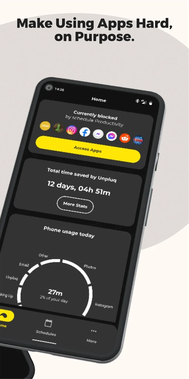 Unpluq Control Your Time Premium s. Users will not be able to waste time scrolling through news feeds. They can also save themselves a long enough time to complete the tasks that need to be done.PRIVACY-FOCUSED & AD-FREEUsers can use their time more reasonably. Work problems will be focused on solving. The information managed by the application is all within the scope of confidentiality. The application has its privacy policy. Users can be completely assured of the level of privacy that the application brings.No Data Selling: User privacy is guaranteed. The application blocks all ads that may appear. Users will not see any ads in the application. They can protec